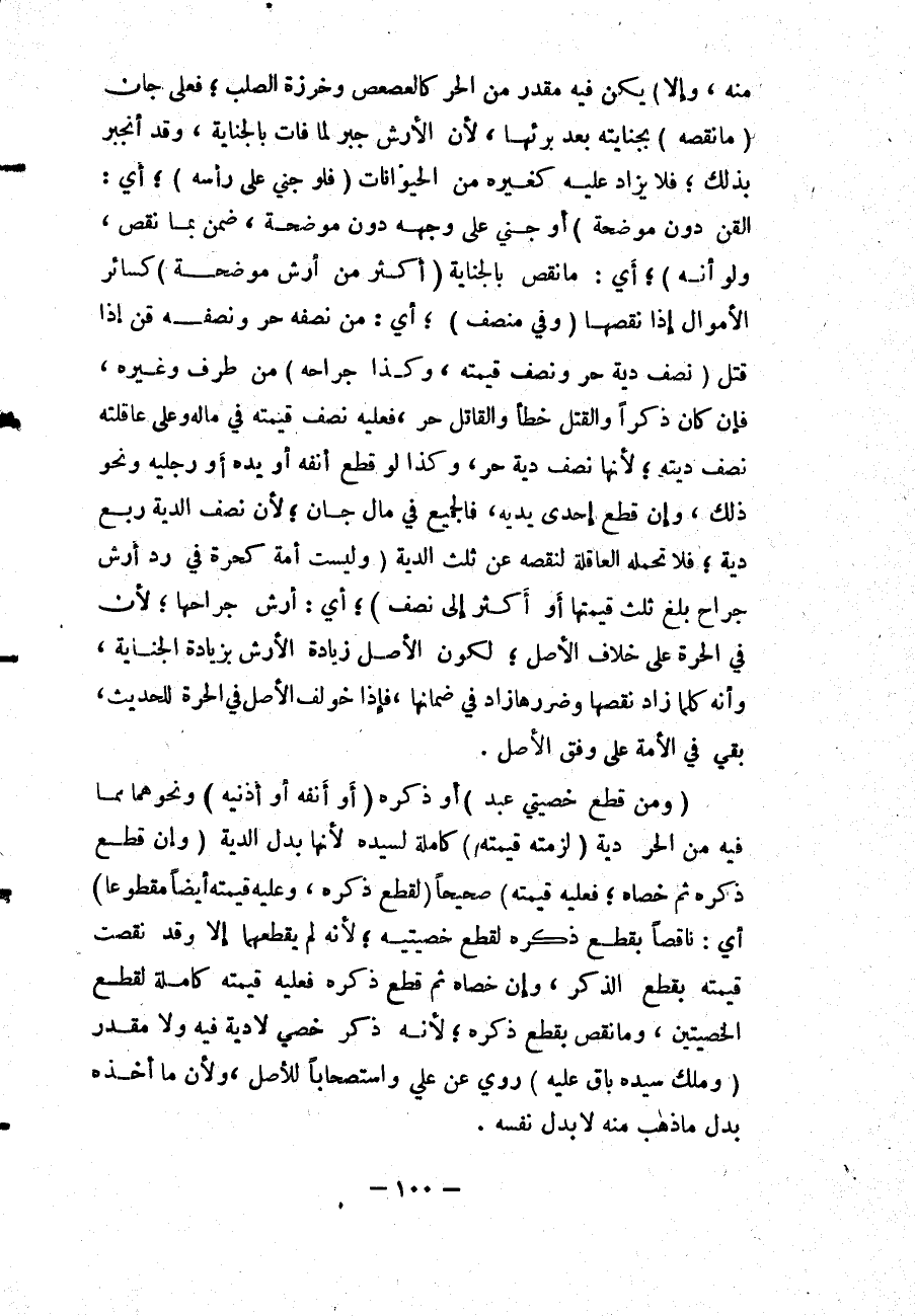 مِنْهُ، وَإِلَّا) يَكُنْ فِيهِ مُقَدَّرٌ مِنْ الْحُرِّ كَالْعُصْعُصِ وَخَرَزَةِ الصُّلْبِ؛ فَعَلَى جَانٍ (مَا نَقَصَهُ) بِجِنَايَتِهِ بَعْدَ بُرْئِهَا؛ لِأَنَّ الْأَرْشَ جَبْرٌ لِمَا فَاتَ بِالْجِنَايَةِ، وَقَدْ أَنْجَبَرَ بِذَلِكَ؛ فَلَا يُزَادُ عَلَيْهِ كَغَيْرِهِ مِنْ الْحَيَوَانَاتِ (فَلَوْ جُنِيَ عَلَى رَأْسِهِ) ؛ أَيْ: الْقِنِّ (دُونَ مُوضِحَةٍ) أَوْ جُنِيَ عَلَى وَجْهِهِ دُونَ مُوضِحَةٍ، ضُمِنَ بِمَا نَقَصَ، (وَلَوْ أَنَّهُ) ؛ أَيْ: مَا نَقَصَ بِالْجِنَايَةِ (أَكْثَرُ مِنْ أَرْشِ مُوضِحَةٍ) كَسَائِرِ الْأَمْوَالِ إذَا نَقَصَهَا (وَفِي مُنَصَّفٍ) ؛ أَيْ: مَنْ نِصْفُهُ حُرٌّ وَنِصْفُهُ قِنٌّ إذَا قُتِلَ (نِصْفُ دِيَةِ حُرٍّ وَنِصْفُ قِيمَتِهِ، وَكَذَا جِرَاحُهُ) مِنْ طَرَفٍ وَغَيْرِهِ، فَإِنْ كَانَ ذَكَرًا وَالْقَتْلُ خَطَأٌ وَالْقَاتِلُ حُرٌّ، فَعَلَيْهِ نِصْفُ قِيمَتِهِ فِي مَالِهِ وَعَلَى عَاقِلَتِهِ نِصْفُ دِيَتِهِ؛ لِأَنَّهَا نِصْفُ دِيَةِ حُرٍّ، وَكَذَا لَوْ قَطَعَ أَنْفَهُ أَوْ يَدَهُ أَوْ رِجْلَيْهِ وَنَحْوَ ذَلِكَ، وَإِنْ قَطَعَ إحْدَى يَدَيْهِ، فَالْجَمِيعُ فِي مَالِ جَانٍ؛ لِأَنَّ نِصْفَ الدِّيَةِ رُبُعُ دِيَةٍ؛ فَلَا تَحْمِلُهُ الْعَاقِلَةُ؛ لِنَقْصِهِ عَنْ ثُلُثِ الدِّيَةِ (وَلَيْسَتْ أَمَةٌ كَحُرَّةٍ فِي رَدِّ أَرْشِ جِرَاحٍ بَلَغَ ثُلُثَ قِيمَتِهَا أَوْ أَكْثَرَ إلَى نِصْفٍ) ؛ أَيْ: أَرْشِ جِرَاحِهَا؛ لِأَنَّ فِي الْحُرَّةِ عَلَى خِلَافِ الْأَصْلِ؛ لِكَوْنِ الْأَصْلِ زِيَادَةَ الْأَرْشِ بِزِيَادَةِ الْجِنَايَةِ، وَأَنَّهُ كُلَّمَا زَادَ نَقْصُهَا وَضَرَرُهَا زَادَ فِي ضَمَانِهَا، فَإِذَا خُولِفَ الْأَصْلُ فِي الْحُرَّةِ لِلْحَدِيثِ، بَقِيَ فِي الْأَمَةِ عَلَى وَفْقِ الْأَصْلِ.