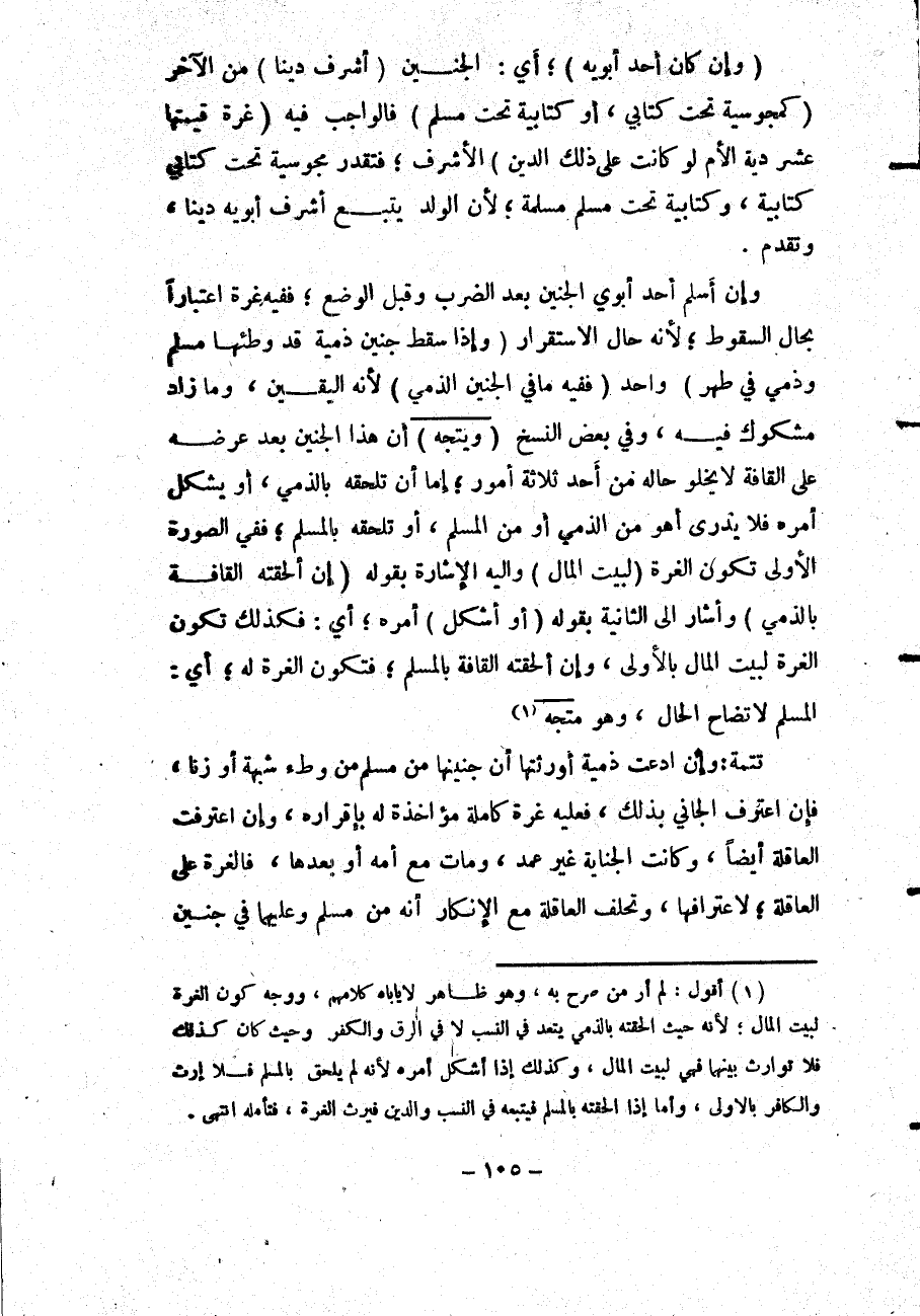(1) تَتِمَّةٌ: وَإِنْ ادَّعَتْ ذِمِّيَّةٌ أَوْ وَرَثَتُهَا، أَنْ جَنِينَهَا مِنْ مُسْلِمٍ مِنْ وَطْءِ شُبْهَةٍ أَوْ زِنًا فَإِنْ اعْتَرَفَ الْجَانِي بِذَلِكَ، فَعَلَيْهِ غُرَّةٌ كَامِلَةٌ مُؤَاخَذَةً لَهُ بِإِقْرَارِهِ، وَإِنْ اعْتَرَفَتْ الْعَاقِلَةُ أَيْضًا، وَكَانَتْ الْجِنَايَةُ غَيْرَ عَمْدٍ، وَمَاتَ مَعَ أُمِّهِ أَوْ بَعْدَهَا، فَالْغُرَّةُ عَلَى الْعَاقِلَةِ؛ لِاعْتِرَافِهَا، وَتَحْلِفُ الْعَاقِلَةُ مَعَ الْإِنْكَارِ أَنَّهُ مِنْ مُسْلِمٍ وَعَلَيْهِمَا فِي جَنِينِ