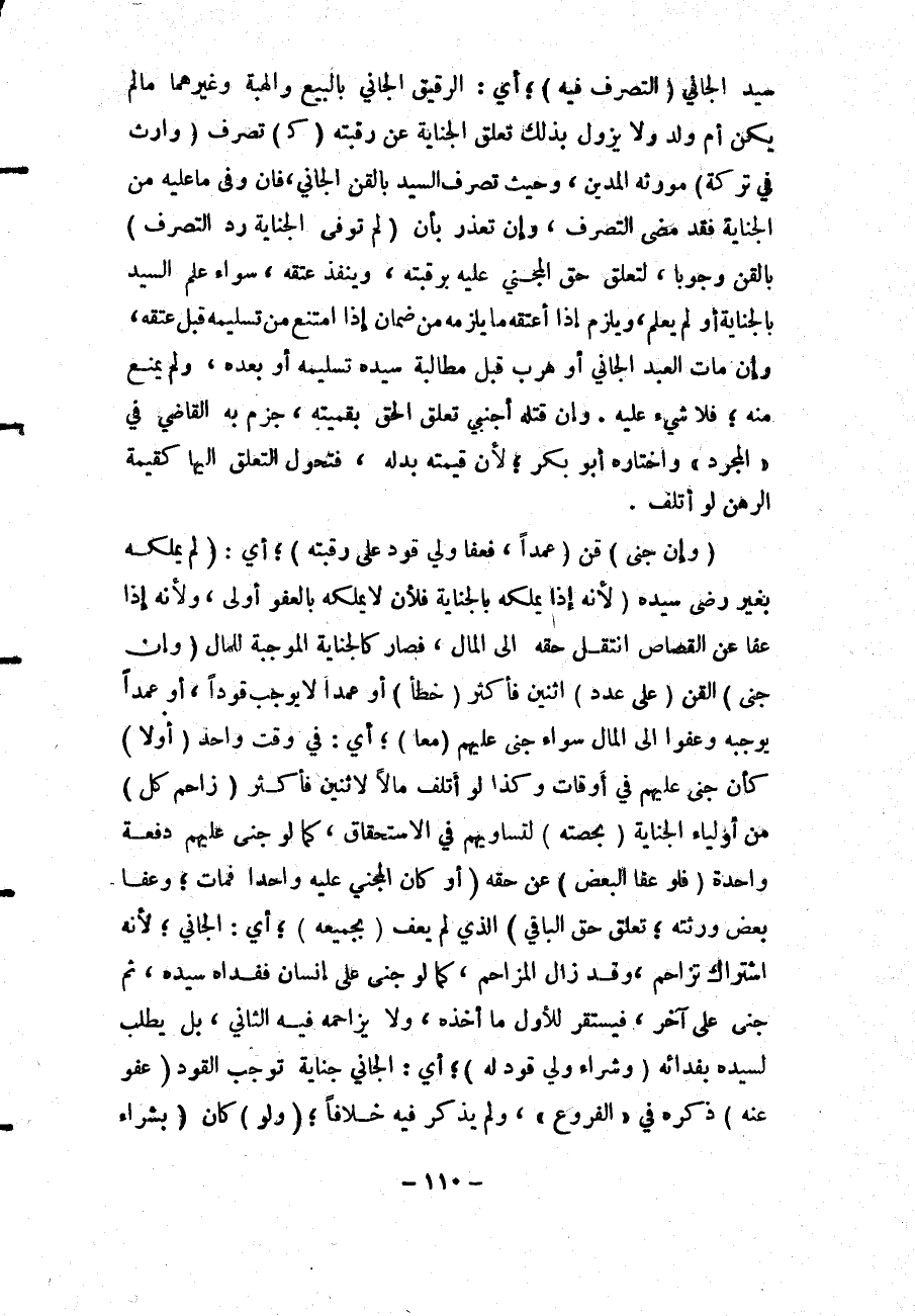سَيِّدِ الْجَانِي (التَّصَرُّفُ فِيهِ) ؛ أَيْ: الرَّقِيقِ الْجَانِي بِالْبَيْعِ وَالْهِبَةِ وَغَيْرِهِمَا مَا لَمْ يَكُنْ أُمَّ وَلَدٍ وَلَا يَزُولُ بِذَلِكَ تَعَلُّقُ الْجِنَايَةِ عَنْ رَقَبَتِهِ (كَ) تَصَرُّفِ (وَارِثٍ فِي تَرِكَةِ) مُوَرِّثِهِ الْمَدِينِ، وَحَيْثُ تَصَرَّفَ السَّيِّدُ بِالْقِنِّ الْجَانِي، فَإِنْ وَفَّى مَا عَلَيْهِ مِنْ الْجِنَايَةِ فَقَدْ مَضَى التَّصَرُّفُ، وَإِنْ تَعَذَّرَ بِأَنْ (لَمْ تُوَفَّ الْجِنَايَةُ رُدَّ التَّصَرُّفُ) بِالْقِنِّ وُجُوبًا؛ لِتَعَلُّقِ حَقِّ الْمَجْنِيِّ عَلَيْهِ بِرَقَبَتِهِ، وَيَنْفُذُ عِتْقُهُ، سَوَاءٌ عَلِمَ السَّيِّدُ بِالْجِنَايَةِ أَوْ لَمْ يَعْلَمْ، وَيَلْزَمُ إذَا أَعْتَقَهُ مَا يَلْزَمُهُ مِنْ ضَمَانٍ إذَا امْتَنَعَ مِنْ تَسْلِيمِهِ قَبْلَ عِتْقِهِ.