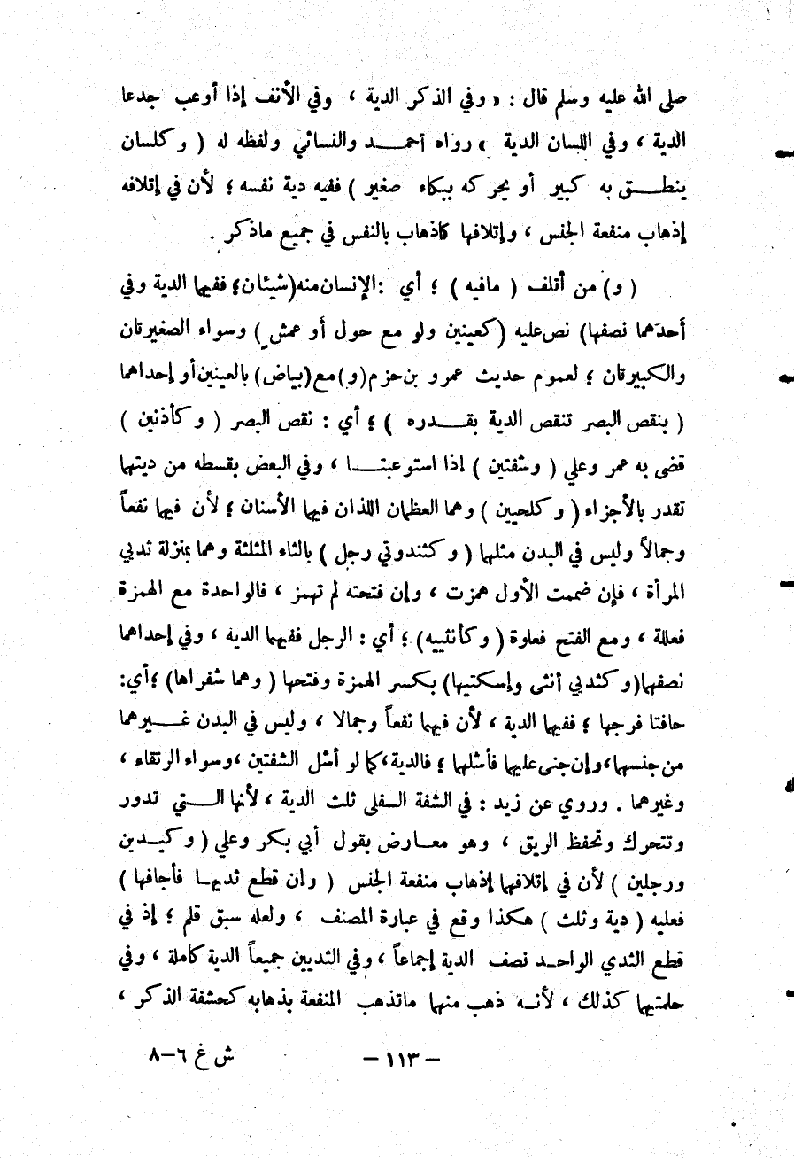 - صَلَّى اللَّهُ عَلَيْهِ وَسَلَّمَ - قَالَ: «وَفِي الذَّكَرِ الدِّيَةُ، وَفِي الْأَنْفِ إذَا أُوعِبَ جَدْعًا الدِّيَةُ، وَفِي اللِّسَانِ الدِّيَةُ» رَوَاهُ أَحْمَدُ وَالنَّسَائِيُّ وَلَفْظُهُ لَهُ.