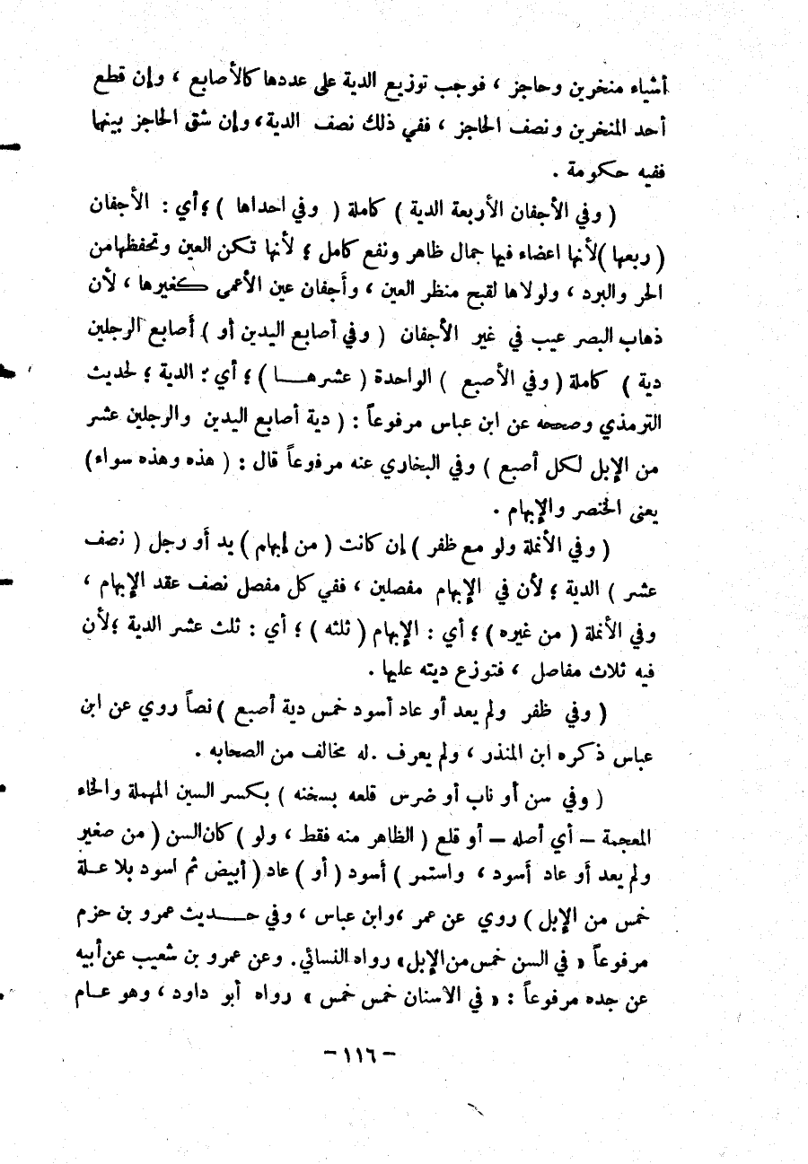 (وَفِي أَصَابِعِ الْيَدَيْنِ أَوْ) أَصَابِعِ (الرِّجْلَيْنِ دِيَةٌ) كَامِلَةٌ (وَفِي الْأُصْبُعِ) الْوَاحِدَةِ (عُشْرُهَا) ؛ أَيْ: الدِّيَةِ؛ لِحَدِيثِ التِّرْمِذِيِّ وَصَحَّحَهُ عَنْ ابْنِ عَبَّاسٍ مَرْفُوعًا: «دِيَةُ أَصَابِعِ الْيَدَيْنِ وَالرِّجْلَيْنِ عَشْرٌ مِنْ الْإِبِلِ لِكُلِّ أُصْبُعٍ» وَفِي الْبُخَارِيِّ عَنْهُ مَرْفُوعًا قَالَ: «هَذِهِ وَهَذِهِ سَوَاءٌ» يَعْنِي الْخِنْصَرَ وَالْإِبْهَامَ.