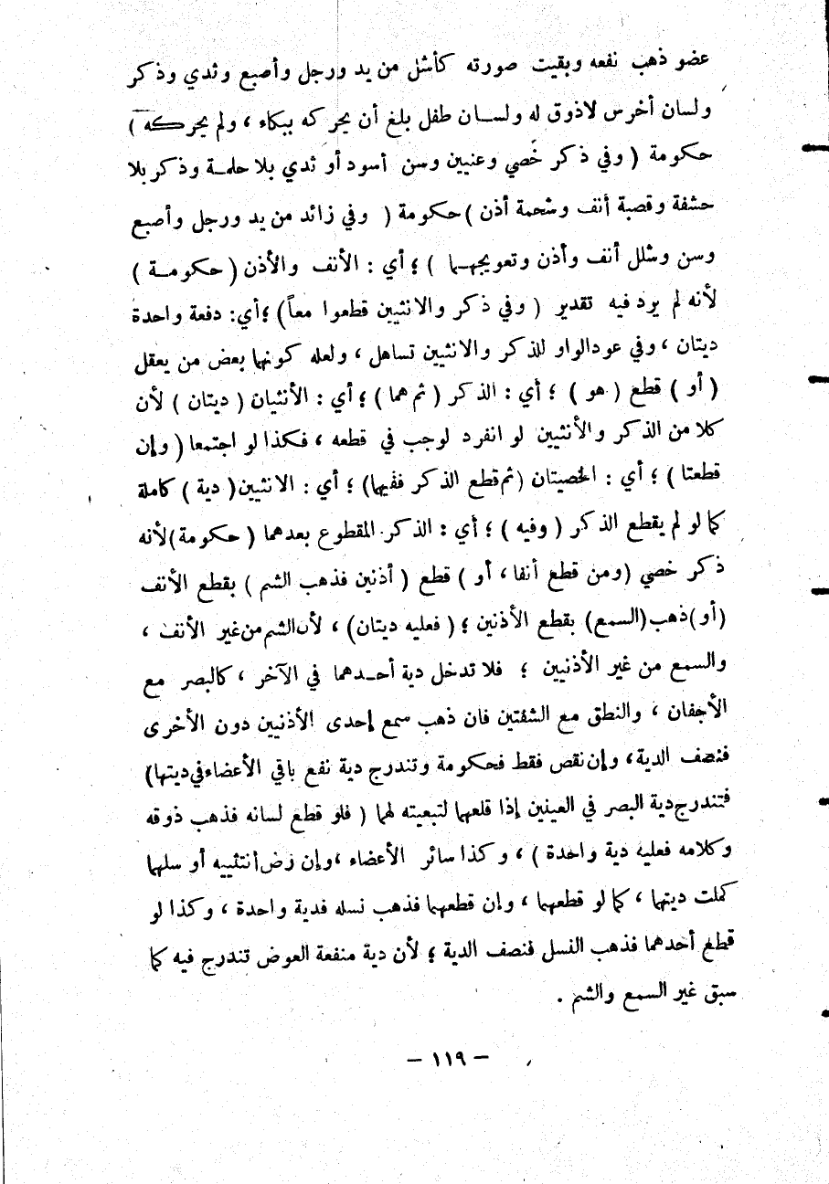 عُضْوٍ ذَهَبَ نَفْعُهُ وَبَقِيَتْ صُورَتُهُ كَأَشَلَّ مِنْ يَدٍ وَرِجْلٍ وَأُصْبُعٍ وَثَدْيٍ وَذَكَرٍ وَلِسَانِ أَخْرَسَ لَا ذَوْقَ لَهُ وَلِسَانِ طِفْلٍ بَلَغَ أَنْ يُحَرِّكَهُ بِبُكَاءٍ، لَمْ يُحَرِّكْهُ) حُكُومَةٌ.