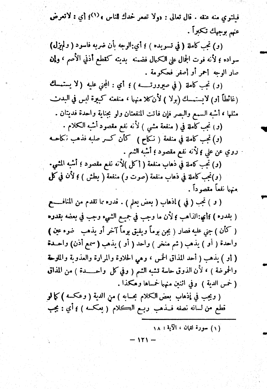 (وَ) تَجِبُ كَامِلَةٌ (فِي تَسْوِيدِهِ) ؛ أَيْ: الْوَجْهِ بِأَنْ ضَرَبَهُ فَاسْوَدَّ (وَلَمْ يَزُلْ) سَوَادُهُ؛ لِأَنَّهُ فَوَّتَ الْجَمَالَ عَلَى الْكَمَالِ فَضَمِنَهُ بِدِيَتِهِ كَقَطْعِ أُذُنَيْ الْأَصَمِّ، وَإِنْ صَارَ الْوَجْهُ أَحْمَرَ أَوْ أَصْفَرَ فَحُكُومَةٌ.