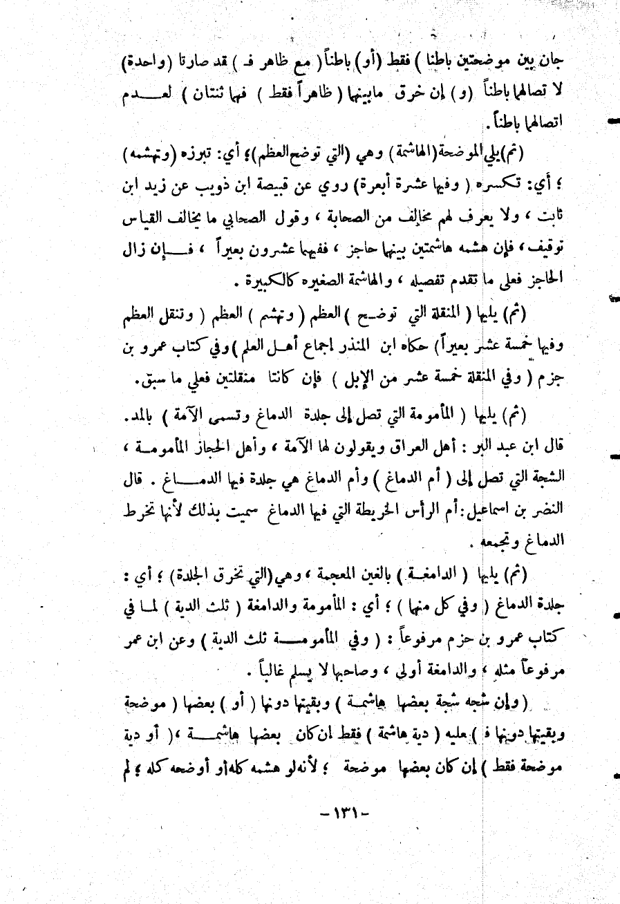 (ثُمَّ) يَلِيهَا (الدَّامِغَةُ) بِالْغَيْنِ الْمُعْجَمَةِ، وَهِيَ (الَّتِي تَخْرِقُ الْجَلْدَةَ) ؛ أَيْ: جَلْدَةَ الدِّمَاغِ (وَفِي كُلٍّ مِنْهُمَا) ؛ أَيْ: الْمَأْمُومَةِ وَالدَّامِغَةِ (ثُلُثُ الدِّيَةِ) لِمَا فِي كِتَابِ عَمْرِو بْنِ حَزْمٍ مَرْفُوعًا: «وَفِي الْمَأْمُومَةِ ثُلُثُ الدِّيَةِ» ) وَعَنْ ابْنِ عُمَرَ مَرْفُوعًا مِثْلُهُ، وَالدَّامِغَةُ أَوْلَى، وَصَاحِبُهَا لَا يَسْلَمُ غَالِبًا.