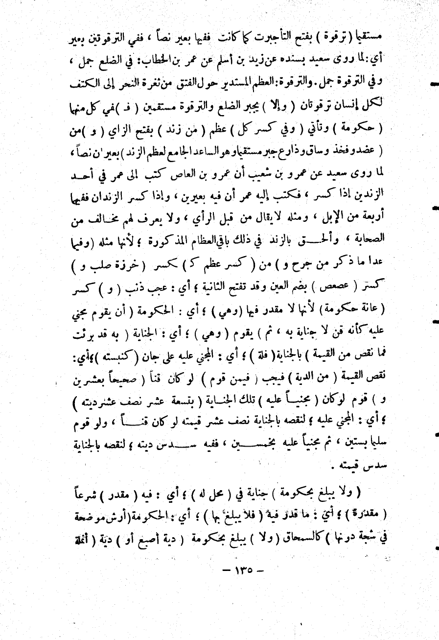 وَمِثْلُهُ لَا يُقَالُ مِنْ قِبَلِ الرَّأْيِ، وَلَا يُعْرَفُ لَهُمْ مُخَالِفٌ مِنْ الصَّحَابَةِ، وَأُلْحِقَ بِالزَّنْدِ فِي ذَلِكَ بَاقِي الْعِظَامِ الْمَذْكُورَةِ؛ لِأَنَّهَا مِثْلُهُ (وَفِيمَا عَدَا مَا ذُكِرَ مِنْ جُرْحٍ وَ) مِنْ (كَسْرِ عَظْمٍ كَ) كَسْرِ (خَرَزَةٍ صُلْبٍ وَ) كَسْرِ (عُصْعُصٍ) بِضَمِّ الْعَيْنِ وَقَدْ تُفْتَحُ الثَّانِيَةُ؛ أَيْ: عُجْبُ ذَنَبٍ (وَ) كَسْرِ (عَانَةٍ حُكُومَةٌ) ؛ لِأَنَّهَا لَا مُقَدَّرَ فِيهَا (وَهِيَ) ؛ أَيْ: الْحُكُومَةُ (أَنْ يُقَوَّمَ مَجْنِيٌّ عَلَيْهِ كَأَنَّهُ قِنٌّ لَا جِنَايَةَ بِهِ، ثُمَّ) يُقَوَّمَ (وَهِيَ) ؛ أَيْ: الْجِنَايَةُ (بِهِ قَدْ بَرِئَتْ فَمَا نَقَصَ مِنْ الْقِيمَةِ) بِالْجِنَايَةِ (فَلَهُ) ؛ أَيْ: الْمَجْنِيِّ عَلَيْهِ عَلَى جَانٍ (كَنِسْبَتِهِ) ؛ أَيْ: نَقْصِ الْقِيمَةِ (مِنْ الدِّيَةِ) فَيَجِبُ (فِيمَنْ قُوِّمَ) لَوْ كَانَ قِنًّا (صَحِيحًا بِعِشْرِينَ وَ) قُوِّمَ لَوْ كَانَ (مَجْنِيًّا عَلَيْهِ) تِلْكَ الْجِنَايَةَ (بِتِسْعَةَ عَشَرَ نِصْفُ عُشْرِ دِيَتِهِ) ؛ أَيْ: الْمَجْنِيِّ عَلَيْهِ؛ لِنَقْصِهِ بِالْجِنَايَةِ نِصْفَ عُشْرِ قِيمَتِهِ لَوْ كَانَ قِنًّا، وَلَوْ قُوِّمَ سَلِيمًا بِسِتِّينَ، ثُمَّ مَجْنِيًّا عَلَيْهِ بِخَمْسِينَ، فَفِيهِ سُدُسُ دِيَتِهِ؛ لِنَقْصِهِ بِالْجِنَايَةِ سُدُسَ قِيمَتِهِ.