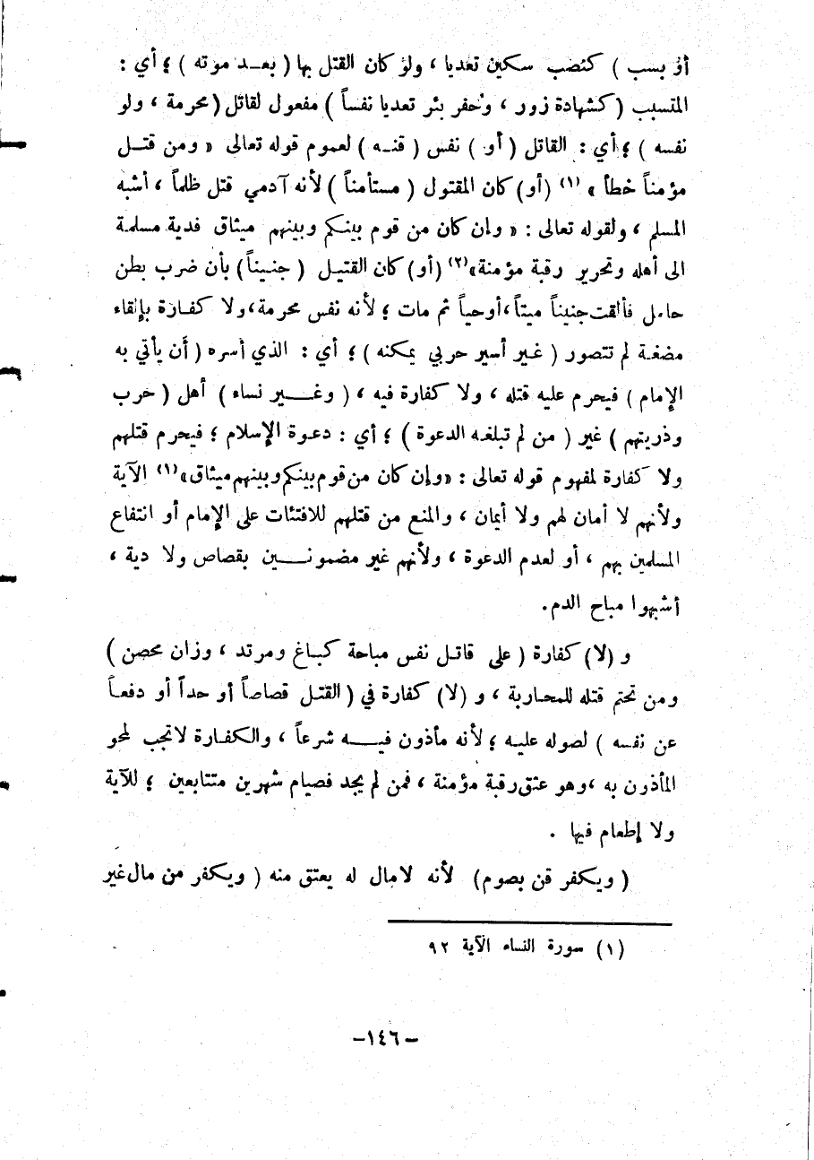 أَوْ بِسَبَبٍ) كَنَصْبِ سِكِّينٍ تَعَدِّيًا، وَلَوْ كَانَ الْقَتْلُ بِهَا (بَعْدَ مَوْتِهِ) ؛ أَيْ: الْمُتَسَبِّبِ (كَشَهَادَةِ زُورٍ، وَحَفْرِ بِئْرٍ تَعَدِّيًا نَفْسًا) مَفْعُولٌ لِقَاتِلِ (مُحَرَّمَةً، وَلَوْ نَفْسَهُ) ؛ أَيْ: الْقَاتِلِ (أَوْ) نَفْسَ (قِنِّهِ) ؛ لِعُمُومِ قَوْله تَعَالَى {وَمَنْ قَتَلَ مُؤْمِنًا خَطَأً} [النساء: 92] (أَوْ) كَانَ الْمَقْتُولُ (مُسْتَأْمَنًا) ؛ لِأَنَّهُ آدَمِيٌّ قُتِلَ ظُلْمًا، أَشْبَهَ الْمُسْلِمَ لِقَوْلِهِ تَعَالَى {وَإِنْ كَانَ مِنْ قَوْمٍ بَيْنَكُمْ وَبَيْنَهُمْ مِيثَاقٌ فَدِيَةٌ مُسَلَّمَةٌ إِلَى أَهْلِهِ وَتَحْرِيرُ رَقَبَةٍ مُؤْمِنَةٍ} [النساء: 92] " (أَوْ) كَانَ الْقَتِيلُ (جَنِينًا) بِأَنْ ضَرَبَ بَطْنَ حَامِلٍ فَأَلْقَتْ جَنِينًا مَيِّتًا، أَوْ حَيًّا ثُمَّ مَاتَ؛ لِأَنَّهُ نَفْسٌ مُحَرَّمَةٌ، وَلَا كَفَّارَةَ؛ بِإِلْقَاءِ مُضْغَةٍ لَمْ تَتَصَوَّرْ (غَيْرَ أَسِيرٍ حَرْبِيٍّ يُمْكِنُهُ) ؛ أَيْ: الَّذِي أَسَرَهُ (أَنْ يَأْتِيَ بِهِ الْإِمَامَ) فَيَحْرُمُ عَلَيْهِ قَتْلُهُ، وَلَا كَفَّارَةَ فِيهِ، (وَغَيْرَ نِسَاءِ) أَهْلِ (حَرْبٍ وَذُرِّيَّتِهِمْ) غَيْرَ (مَنْ لَمْ تَبْلُغْهُ الدَّعْوَةُ) ؛ أَيْ: دَعْوَةُ الْإِسْلَامِ؛ فَيَحْرُمُ قَتْلُهُمْ وَلَا كَفَّارَةَ؛ لِمَفْهُومِ قَوْله تَعَالَى: {وَإِنْ كَانَ مِنْ قَوْمٍ بَيْنَكُمْ وَبَيْنَهُمْ مِيثَاقٌ} [النساء: 92] الْآيَةَ؛ وَلِأَنَّهُمْ لَا أَمَانَ لَهُمْ وَلَا إيمَانَ، وَالْمَنْعُ مِنْ قَتْلِهِمْ؛ لِلِافْتِئَاتِ عَلَى الْإِمَامِ أَوْ انْتِفَاعِ الْمُسْلِمِينَ بِهِمْ؛ أَوْ لِعَدَمِ الدَّعْوَةِ؛ وَلِأَنَّهُمْ غَيْرُ مَضْمُونِينَ بِقِصَاصٍ وَلَا دِيَةٍ، أَشْبَهُوا مُبَاحَ الدَّمِ.