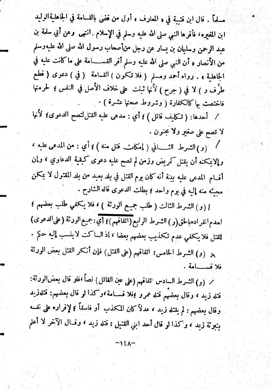 أَحَدُهَا: (تَكْلِيفُ قَاتِلٍ) ؛ أَيْ: مُدَّعًى عَلَيْهِ الْقَتْلَ؛ لِتَصِحَّ الدَّعْوَى؛ لِأَنَّهَا لَا تَصِحُّ عَلَى صَغِيرٍ وَلَا مَجْنُونٍ.