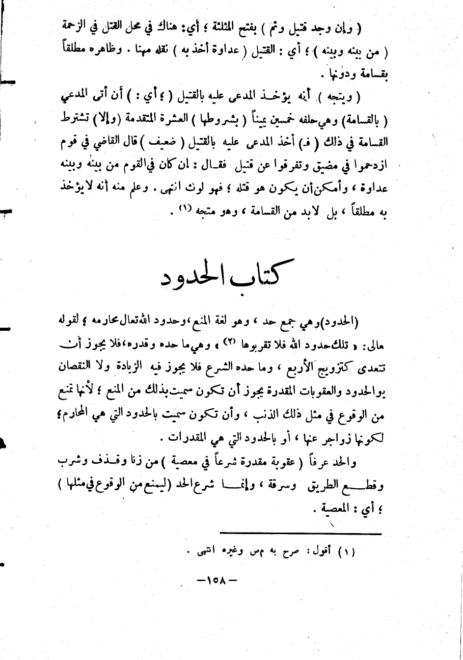 (الْحُدُودُ) وَهِيَ جَمْعُ حَدٍّ، وَهُوَ لُغَةً الْمَنْعُ، وَحُدُودُ اللَّهِ تَعَالَ مَحَارِمُهُ؛ لِقَوْلِهِ تَعَالَى: {تِلْكَ حُدُودُ اللَّهِ فَلا تَقْرَبُوهَا} [البقرة: 187] وَهِيَ مَا حَدَّهُ وَقَدَّرَهُ، فَلَا يَجُوزُ أَنْ تُتَعَدَّى كَتَزَوُّجِ الْأَرْبَعِ، وَمَا حَدَّهُ الشَّرْعُ فَلَا يَجُوزُ فِيهِ الزِّيَادَةُ وَلَا النُّقْصَانُ وَالْحُدُودُ وَالْعُقُوبَاتُ الْمُقَدَّرَةُ يَجُوزُ أَنْ تَكُونَ سُمِّيَتْ بِذَلِكَ مِنْ الْمَنْعِ؛ لِأَنَّهَا تَمْنَعُ مِنْ الْوُقُوعِ فِي مِثْلِ ذَلِكَ الذَّنْبِ، وَأَنْ تَكُونَ سُمِّيَتْ بِالْحُدُودِ الَّتِي هِيَ الْمَحَارِمُ؛ لِكَوْنِهَا زَوَاجِرَ عَنْهَا، أَوْ بِالْحُدُودِ الَّتِي هِيَ الْمُقَدَّرَاتُ. وَالْحَدُّ عُرْفًا (عُقُوبَةٌ مُقَدَّرَةٌ شَرْعًا فِي مَعْصِيَةٍ) مِنْ زِنًا وَقَذْفٍ وَشُرْبٍ وَقَطْعِ الطَّرِيقِ وَسَرِقَةٍ، وَإِنَّمَا شُرِعَ الْحَدُّ (لِيَمْنَعَ مِنْ الْوُقُوعِ فِي مِثْلِهَا) ؛ أَيْ: الْمَعْصِيَةِ.