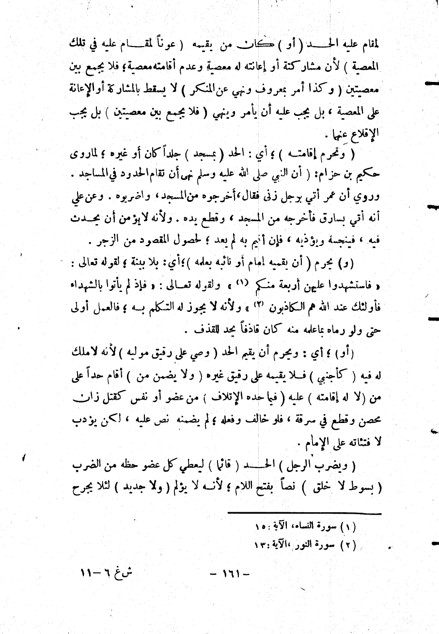 (وَتَحْرُمُ إقَامَتُهُ) ؛ أَيْ: الْحَدِّ (بِمَسْجِدٍ) جَلْدًا كَانَ أَوْ غَيْرَهُ؛ لِمَا رَوَى حَكِيمُ بْنُ حِزَامٍ: أَنَّ النَّبِيَّ - صَلَّى اللَّهُ عَلَيْهِ وَسَلَّمَ - «نَهَى أَنْ تُقَامَ الْحُدُودُ فِي الْمَسَاجِدِ» . وَرُوِيَ أَنَّ عُمَرَ أُتِيَ بِرَجُلٍ زَنَى فَقَالَ؛ أَخْرِجُوهُ مِنْ الْمَسْجِدِ، وَاضْرِبُوهُ. وَعَنْ عَلِيٍّ أَنَّهُ أُتِيَ بِسَارِقٍ فَأَخْرَجَهُ مِنْ الْمَسْجِدِ، وَقَطَعَ يَدَهُ، وَلِأَنَّهُ لَا يُؤْمَنُ أَنْ يُحْدِثَ فِيهِ، فَيُنَجِّسَهُ وَيُؤْذِيَهُ، فَإِنْ أُقِيمَ بِهِ لَمْ يَعُدْ، لِحُصُولِ الْمَقْصُودِ مِنْ الزَّجْرِ.
