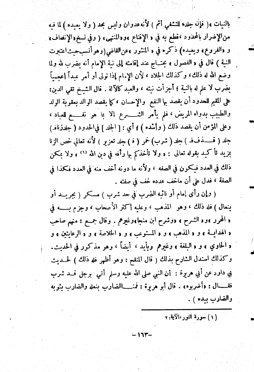 قَالَ فِي " الْفُصُولِ: يُحْتَاجُ عِنْدَ إقَامَتِهِ إلَى نِيَّةِ الْإِمَامِ أَنْ يَضْرِبَ لِلَّهِ وَلِمَا وَضَعَ اللَّهُ لَهُ ذَلِكَ، وَكَذَلِكَ الْجَلَّادُ، لِأَنَّ الْإِمَامَ إذَا تَوَلَّى أَوْ أَمَرَ عَبْدًا أَعْجَمِيًّا يَضْرِبُ لَا عِلْمَ لَهُ بِالنِّيَّةِ؛ أَجْزَأَتْ نِيَّتُهُ، وَالْعَبْدُ كَالْآلَةِ. قَالَ الشَّيْخُ تَقِيُّ الدِّينِ: عَلَى الْمُقِيمِ لِلْحُدُودِ أَنْ يَقْصِدَ بِهَا النَّفْعَ وَالْإِحْسَانَ، كَمَا يَقْصِدُ الْوَالِدُ بِعُقُوبَةِ الْوَلَدِ وَالطَّبِيبُ بِدَوَاءِ الْمَرِيضِ، فَلَمْ يَأْمُرْ الشَّرْعُ إلَّا بِمَا هُوَ نَفْعٌ لِلْعِبَادِ، وَعَلَى الْمُؤْمِنِ أَنْ يَقْصِدَ ذَلِكَ (وَأَشَدُّهُ) ؛ أَيْ: [الْجَلْدِ] فِي الْحُدُودِ (جَلْدُ زِنًا فَ) جَلْدُ (قَذْفٍ فَ) جَلْدُ (شُرْبِ) خَمْرٍ (فَ) جَلْدُ (تَعْزِيرٍ) لِأَنَّهُ تَعَالَى خَصَّ الزِّنَا بِمَزِيدِ تَأْكِيدٍ بِقَوْلِهِ تَعَالَى: " {وَلا تَأْخُذْكُمْ بِهِمَا رَأْفَةٌ فِي دِينِ اللَّهِ} [النور: 2] وَلَا يُمْكِنُ ذَلِكَ فِي الْعَدَدِ فَيَكُونُ فِي الصِّفَةِ، وَلِأَنَّ مَا دُونَهُ أَخَفُّ مِنْهُ فِي الْعَدَدِ فَكَذَا فِي الصِّفَةِ، فَدَلَّ عَلَى أَنَّ مَا خَفَّ عَدَدُهُ خَفَّ فِي صِفَتِهِ.