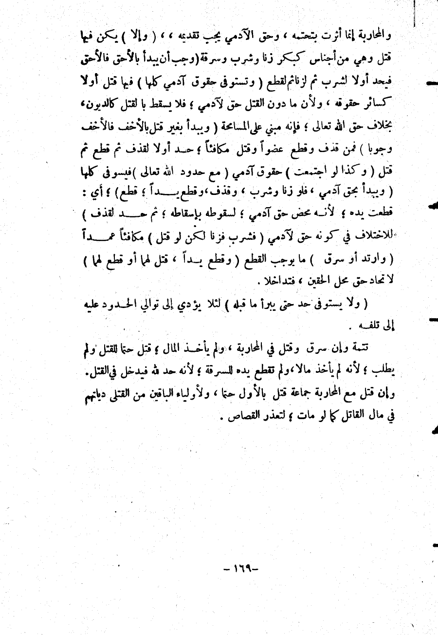 وَالْمُحَارَبَةُ إنَّمَا أَثَّرَتْ بِتَحَتُّمِهِ، وَحَقُّ الْآدَمِيِّ يَجِبُ تَقْدِيمُهُ، (وَإِلَّا) يَكُنْ فِيهَا قَتْلٌ وَهِيَ مِنْ أَجْنَاسٍ كَبِكْرٍ زَنَى وَشُرْبٍ وَسَرِقَةٍ (وَجَبَ أَنْ يَبْدَأَ بِالْأَحَقِّ فَالْأَحَقُّ) فَيَحُدُّ أَوَّلًا لِشُرْبٍ ثُمَّ لِزِنًا ثُمَّ لِقَطْعٍ (وَتُسْتَوْفَى حُقُوقُ آدَمِيٍّ كُلُّهَا) فِيهَا قَتْلٌ أَوْ لَا كَسَائِرِ حُقُوقِهِ، وَلِأَنَّ مَا دُونَ الْقَتْلِ حَقٌّ لِآدَمِيٍّ؛ فَلَا يَسْقُطُ بِالْقَتْلِ كَالدُّيُونِ، بِخِلَافِ حَقِّ اللَّهِ تَعَالَى؛ فَإِنَّهُ مَبْنِيٌّ عَلَى الْمُسَامَحَةِ.