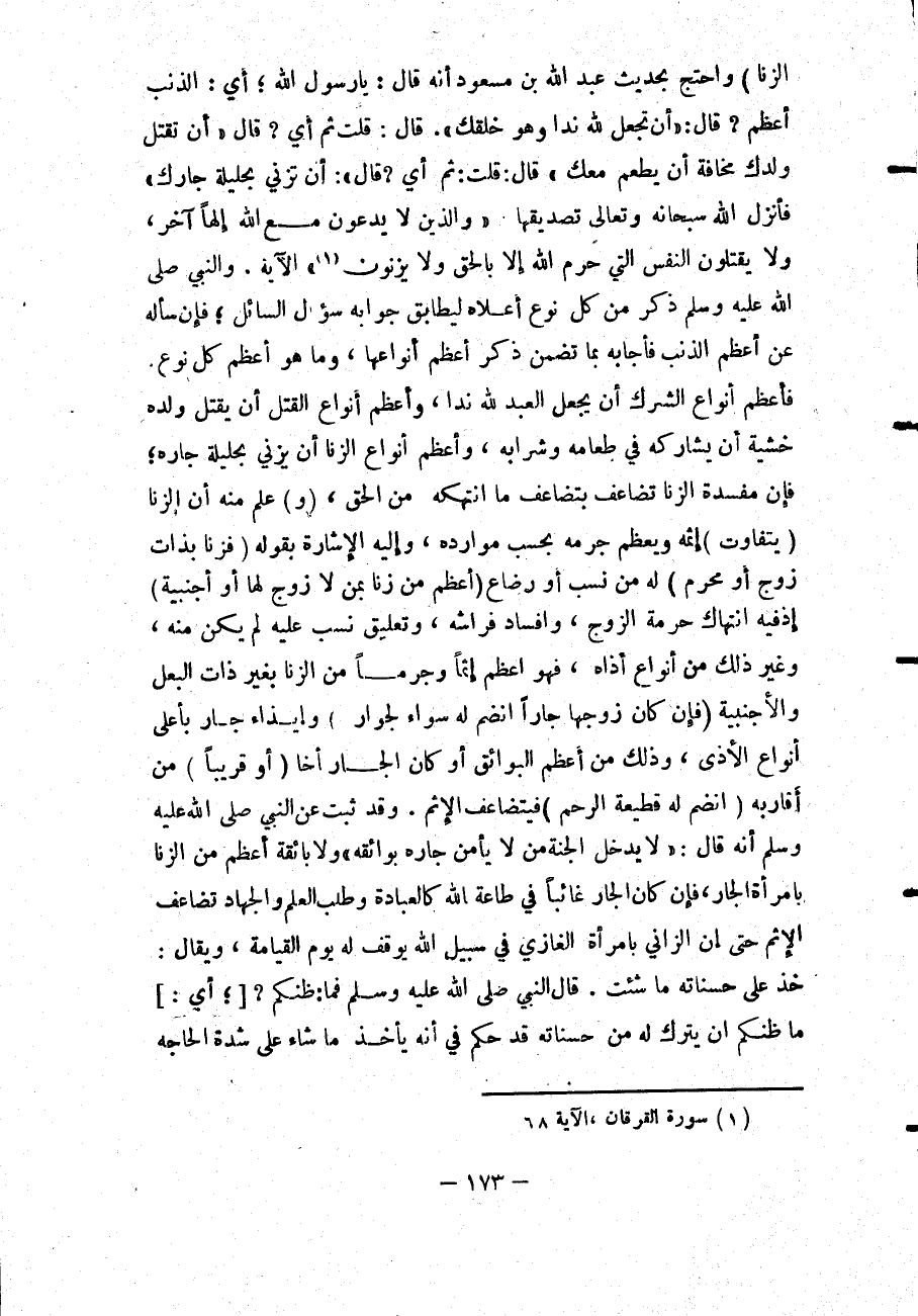 عَبْدِ اللَّهِ بْنِ مَسْعُودٍ أَنَّهُ قَالَ: «يَا رَسُولَ اللَّهِ؛ أَيُّ: الذَّنْبِ أَعْظَمُ؟ قَالَ: أَنْ تَجْعَلَ لِلَّهِ نِدًّا وَهُوَ خَلَقَكَ. قَالَ: قُلْتُ ثُمَّ أَيٌّ؟ قَالَ أَنْ تَقْتُلَ وَلَدَكَ مَخَافَةَ أَنْ يَطْعَمَ مَعَكَ قَالَ: قُلْتُ: ثُمَّ أَيٌّ؟ قَالَ: أَنْ تَزْنِيَ بِحَلِيلَةِ جَارِكَ فَأَنْزَلَ اللَّهُ سُبْحَانَهُ وَتَعَالَى تَصْدِيقَهَا {وَالَّذِينَ لا يَدْعُونَ مَعَ اللَّهِ إِلَهًا آخَرَ وَلا يَقْتُلُونَ النَّفْسَ الَّتِي حَرَّمَ اللَّهُ إِلا بِالْحَقِّ وَلا يَزْنُونَ} [الفرقان: 68] الْآيَةَ» . وَالنَّبِيُّ - صَلَّى اللَّهُ عَلَيْهِ وَسَلَّمَ - ذَكَرَ مِنْ كُلِّ نَوْعٍ أَعْلَاهُ لِيُطَابِقَ جَوَابُهُ سُؤَالَ السَّائِلِ؛ فَإِنْ سَأَلَهُ عَنْ أَعْظَمِ الذَّنْبِ فَأَجَابَهُ بِمَا تَضَمَّنَ ذِكْرَ أَعْظَمِ أَنْوَاعِهَا، وَمَا هُوَ أَعْظَمُ كُلِّ نَوْعٍ.