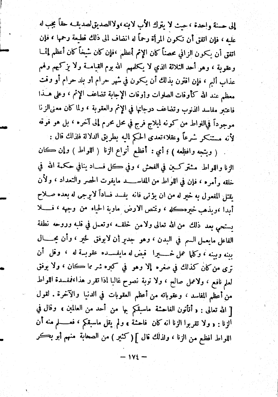وَقَالَ فِي الزِّنَا: " {وَلا تَقْرَبُوا الزِّنَا إِنَّهُ كَانَ فَاحِشَةً} [الإسراء: 32] وَلَمْ يَقُلْ مَا سَبَقَكُمْ، فَعُلِمَ مِنْهُ أَنَّ اللِّوَاطَ أَفْظَعُ مِنْ الزِّنَا، وَلِذَلِكَ قَالَ] (كَثِيرٌ) مِنْ الصَّحَابَةِ مِنْهُمْ أَبُو بَكْرٍ