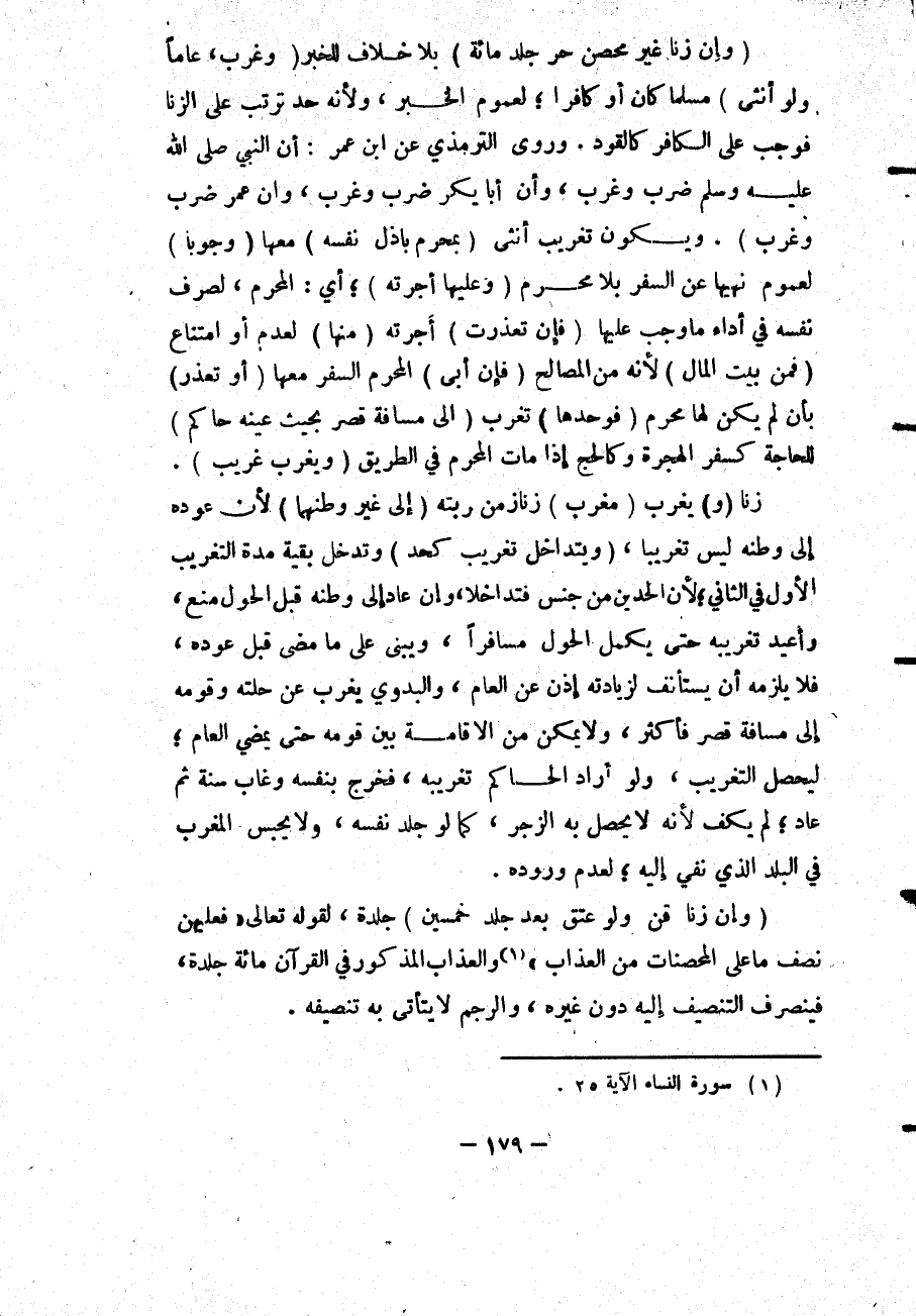 (وَإِنْ زَنَى غَيْرُ مُحْصَنٍ حُرٌّ جُلِدَ مِائَةً) بِلَا خِلَافٍ لِلْخَبَرِ (وَغُرِّبَ، عَامًا وَلَوْ أُنْثَى) مُسْلِمًا كَانَ أَوْ كَافِرًا؛ لِعُمُومِ الْخَبَرِ، وَلِأَنَّهُ حَدٌّ تَرَتَّبَ عَلَى الزِّنَا فَوَجَبَ عَلَى الْكَافِرِ كَالْقَوَدِ.