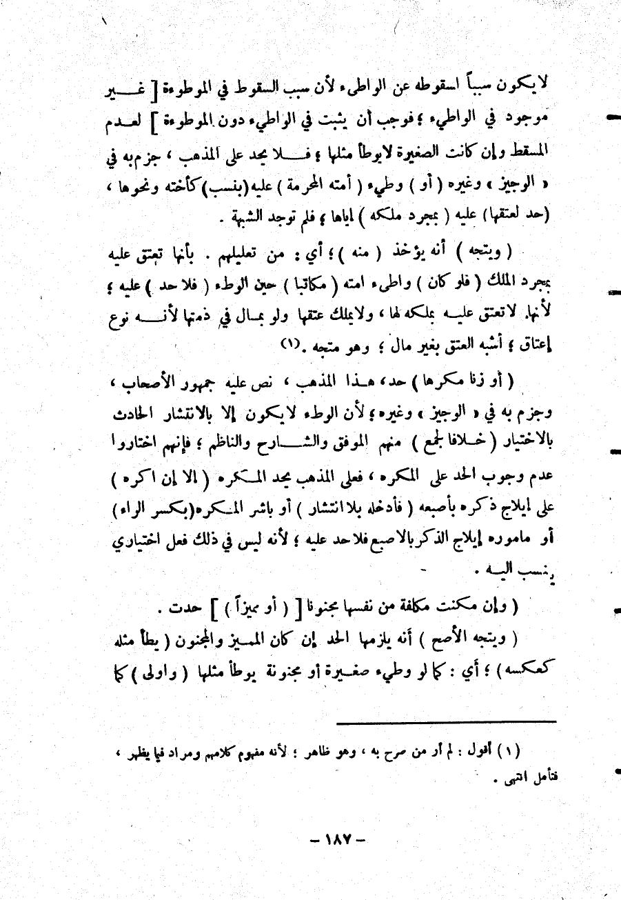 لَا يَكُونُ سَبَبًا لِسُقُوطِهِ عَنْ الْوَاطِئِ لِأَنَّ سَبَبَ السُّقُوطِ فِي الْمَوْطُوءَةِ [غَيْرُ مَوْجُودٍ فِي الْوَاطِئِ؛ فَوَجَبَ أَنْ يَثْبُتَ فِي الْوَاطِئِ دُونَ الْمَوْطُوءَةِ] لِعَدَمِ الْمُسْقِطِ، وَإِنْ كَانَتْ الصَّغِيرَةُ لَا يُوطَأُ مِثْلُهَا؛ فَلَا يُحَدُّ عَلَى الْمَذْهَبِ، جَزَمَ بِهِ فِي " الْوَجِيزِ " وَغَيْرِهِ (أَوْ) وَطِئَ (أَمَتَهُ الْمُحَرَّمَةَ) عَلَيْهِ (بِنَسَبٍ) كَأُخْتِهِ وَنَحْوِهَا، (حُدَّ لِعِتْقِهَا) عَلَيْهِ (بِمُجَرَّدِ مِلْكِهِ) إيَّاهَا؛ فَلَمْ تُوجَدْ الشُّبْهَةُ.