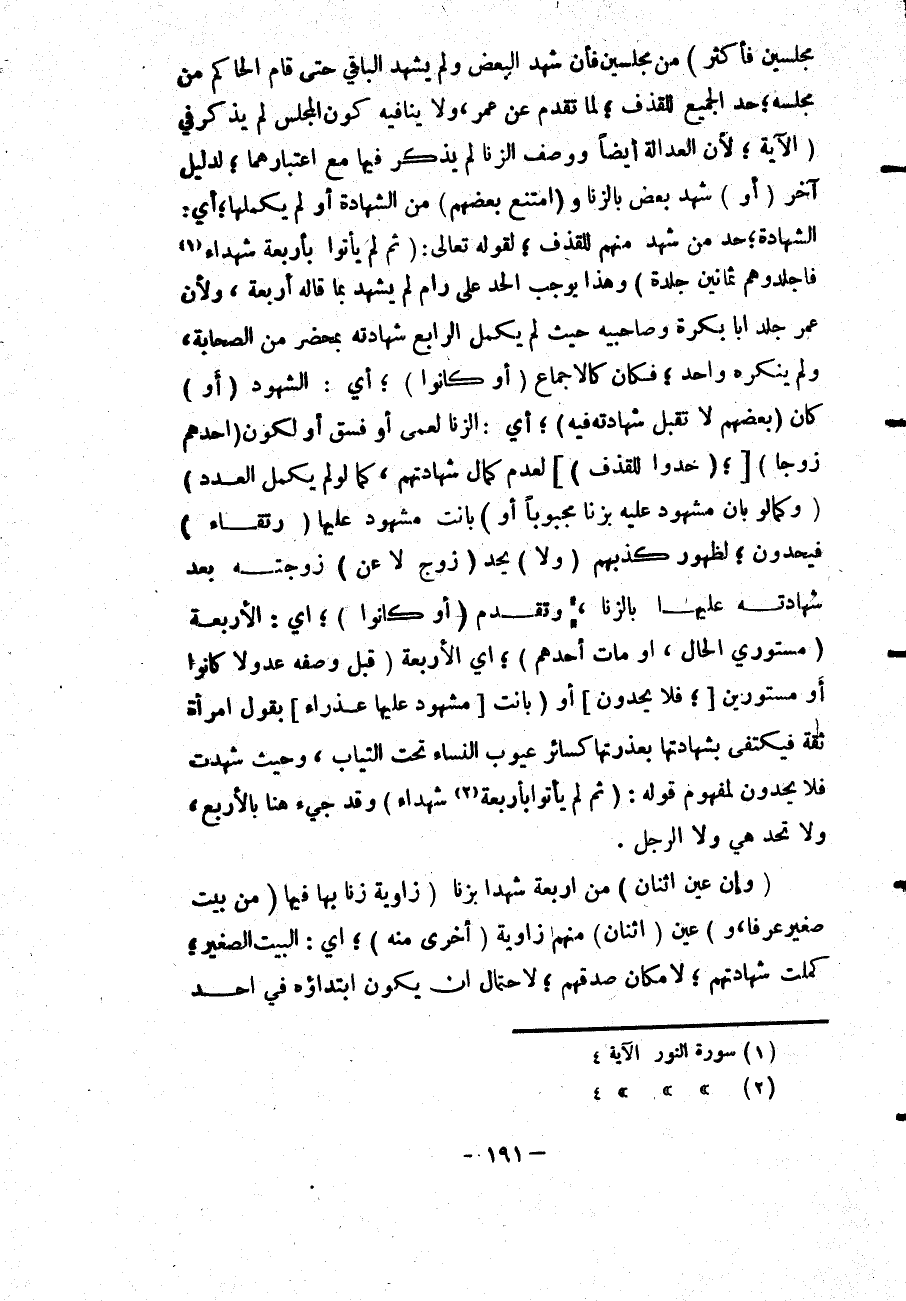 (مَجْلِسَيْنِ فَأَكْثَرَ) مِنْ مَجْلِسَيْنِ فَإِنْ شَهِدَ الْبَعْضُ وَلَمْ يَشْهَدْ الْبَاقِي حَتَّى قَامَ الْحَاكِمُ مِنْ مَجْلِسِهِ، حُدَّ الْجَمِيعُ لِلْقَذْفِ؛ لِمَا تَقَدَّمَ عَنْ عُمَرَ، وَلَا يُنَافِيهِ كَوْنُ الْمَجْلِسِ لَمْ يُذْكَرْ فِي (الْآيَةِ؛ لِأَنَّ الْعَدَالَةَ أَيْضًا وَوَصْفَ الزِّنَا لَمْ يُذْكَرْ فِيهَا مَعَ اعْتِبَارِهِمَا) ؛ لِدَلِيلٍ آخَرَ.