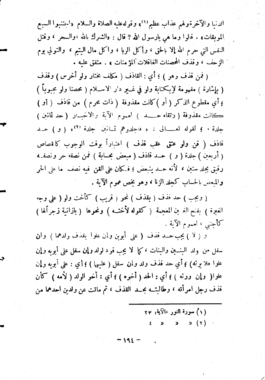 {إِنَّ الَّذِينَ يَرْمُونَ الْمُحْصَنَاتِ الْغَافِلاتِ الْمُؤْمِنَاتِ لُعِنُوا فِي الدُّنْيَا وَالآخِرَةِ وَلَهُمْ عَذَابٌ عَظِيمٌ} [النور: 23] وَقَوْلِهِ - عَلَيْهِ الصَّلَاةُ وَالسَّلَامُ - «اجْتَنِبُوا السَّبْعَ الْمُوبِقَاتِ، قَالُوا وَمَا هِيَ يَا رَسُولَ اللَّهِ؟ قَالَ: الشِّرْكُ بِاَللَّهِ وَالسِّحْرُ، وَقَتْلُ النَّفْسِ الَّتِي حَرَّمَ اللَّهُ إلَّا بِالْحَقِّ، وَأَكْلُ الرِّبَا، وَأَكْلُ مَالِ الْيَتِيمِ، وَالتَّوَلِّي يَوْمَ الزَّحْفِ، وَقَذْفُ الْمُحْصَنَاتِ الْغَافِلَاتِ الْمُؤْمِنَاتِ» مُتَّفَقٌ عَلَيْهِ.