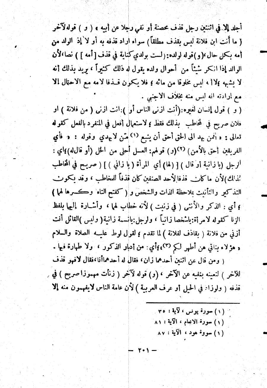 (وَ) قَوْلُ إنْسَانٍ لِغَيْرِهِ: (أَنْتِ أَزَنَى النَّاسِ أَوْ) : أَنْتِ أَزَنَى (مِنْ فُلَانَةَ) أَوْ فُلَانٍ صَرِيحٌ فِي الْمُخَاطَبِ بِذَلِكَ فَقَطْ؛ لِاسْتِعْمَالِ أَفْعَلَ فِي الْمُنْفَرِدِ بِالْفِعْلِ كَقَوْلِهِ تَعَالَى: " {أَفَمَنْ يَهْدِي إِلَى الْحَقِّ أَحَقُّ أَنْ يُتَّبَعَ أَمَّنْ لا يَهِدِّي} [يونس: 35] وَقَوْلِهِ: {فَأَيُّ الْفَرِيقَيْنِ أَحَقُّ بِالأَمْنِ} [الأنعام: 81] .