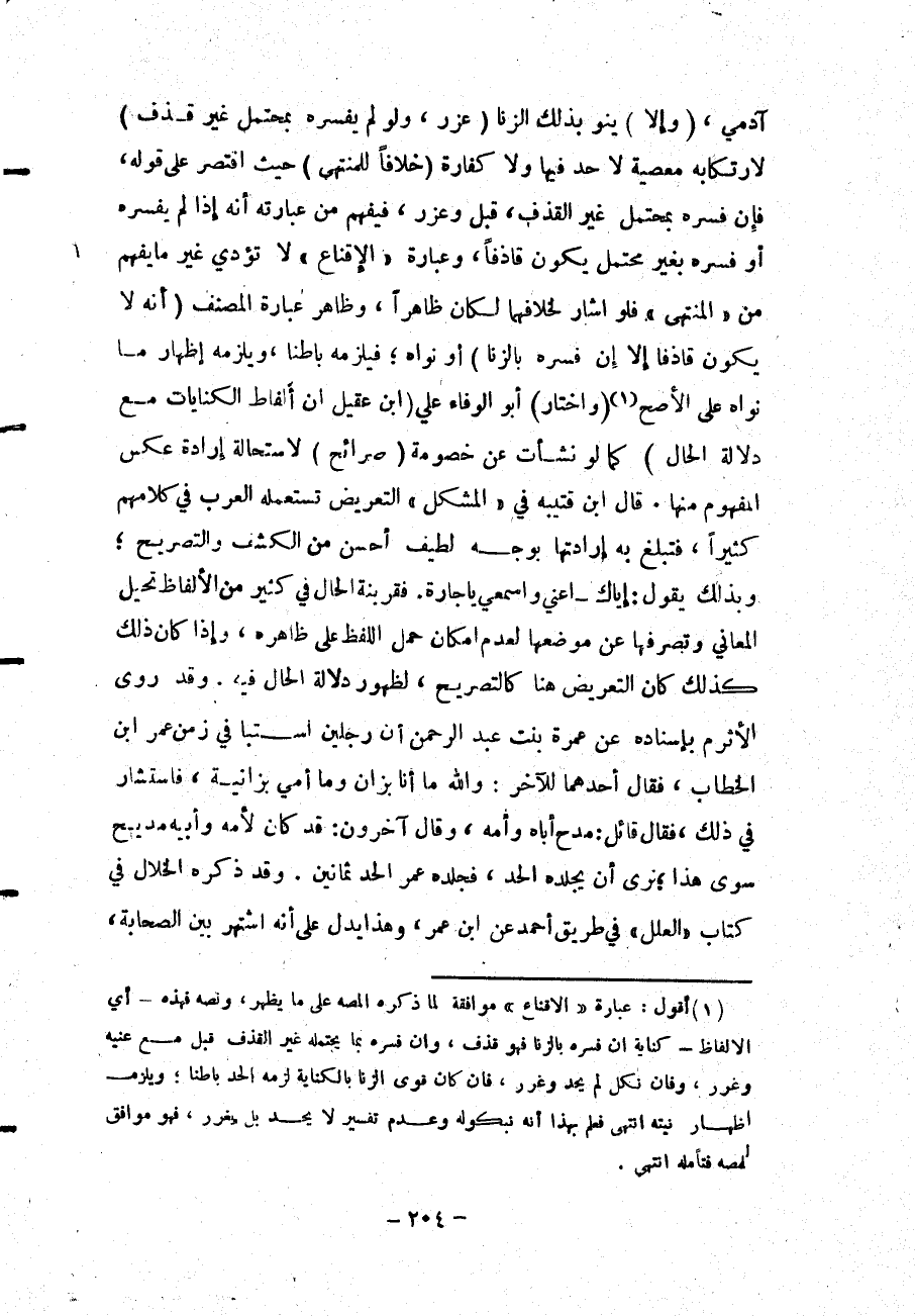 آدَمِيٍّ، (وَإِلَّا) يَنْوِ بِذَلِكَ الزِّنَا (عُزِّرَ، وَلَوْ لَمْ يُفَسِّرْهُ بِمُحْتَمَلٍ غَيْرِ قَذْفٍ) لِارْتِكَابِهِ مَعْصِيَةً لَا حَدَّ فِيهَا وَلَا كَفَّارَةَ (خِلَافًا لِلْمُنْتَهَى) حَيْثُ اقْتَصَرَ عَلَى قَوْلِهِ، فَإِنْ فَسَّرَهُ بِمُحْتَمَلٍ غَيْرِ الْقَذْفِ، قُبِلَ وَعُزِّرَ، فَيُفْهَمُ مِنْ عِبَارَتِهِ أَنَّهُ إذَا لَمْ يُفَسِّرْهُ أَوْ فَسَّرَهُ بِغَيْرِ مُحْتَمَلٍ يَكُونُ قَاذِفًا، وَعِبَارَةُ الْإِقْنَاعِ لَا تُؤَدِّي غَيْرَ مَا يُفْهَمُ مِنْ " الْمُنْتَهَى " فَلَوْ أَشَارَ لِخِلَافِهِمَا لَكَانَ ظَاهِرًا، وَظَاهِرُ عِبَارَةِ الْمُصَنِّفِ (أَنَّهُ لَا يَكُونُ قَاذِفًا إلَّا إنْ فَسَّرَهُ بِالزِّنَا) أَوْ نَوَاهُ؛ فَيَلْزَمُهُ بَاطِنًا، وَيَلْزَمُهُ إظْهَارُ مَا نَوَاهُ عَلَى الْأَصَحِّ (وَاخْتَارَ) أَبُو الْوَفَاءِ عَلِيُّ (ابْنُ عَقِيلٍ أَنَّ أَلْفَاظَ الْكِنَايَاتِ مَعَ دَلَالَةِ الْحَالِ) كَمَا لَوْ نَشَأَتْ عَنْ خُصُومَةٍ (صَرَائِحُ) لِاسْتِحَالَةِ إرَادَةِ عَكْسِ الْمَفْهُومِ مِنْهَا. قَالَ ابْنُ قُتَيْبَةَ فِي الْمُشْكَلِ " التَّعْرِيضُ تَسْتَعْمِلُهُ الْعَرَبُ فِي كَلَامِهِمْ كَثِيرًا، فَتَبْلُغُ بِهِ إرَادَتَهَا بِوَجْهٍ لَطِيفٍ أَحْسَنَ مِنْ الْكَشْفِ وَالتَّصْرِيحِ؛ وَبِذَلِكَ يَقُولُ: إيَّاكَ - أَعْنِي وَاسْمَعِي يَا جَارَةُ. فَقَرِينَةُ الْحَالِ فِي كَثِيرٍ مِنْ الْأَلْفَاظِ تُحِيلُ الْمَعَانِيَ وَتَصْرِفُهَا عَنْ مَوْضِعِهَا لِعَدَمِ إمْكَانِ حَمْلِ اللَّفْظِ عَلَى ظَاهِرِهِ، وَإِذَا كَانَ ذَلِكَ كَذَلِكَ كَانَ التَّعْرِيضُ هُنَا كَالتَّصْرِيحِ، لِظُهُورِ دَلَالَةِ الْحَالِ فِيهِ.