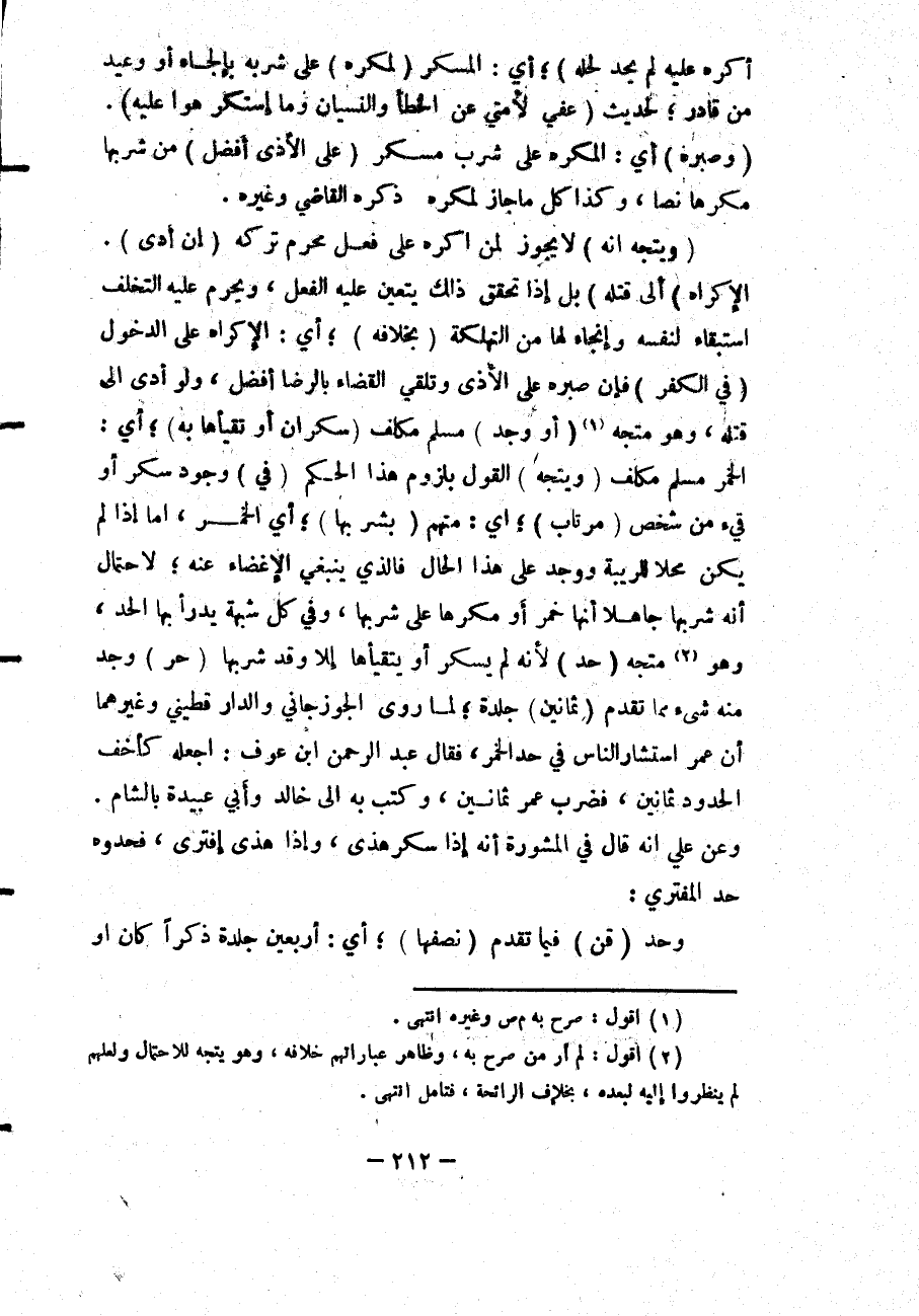 أُكْرِهَ عَلَيْهِ لَمْ يُحَدَّ لِحِلِّهِ) ؛ أَيْ: الْمُسْكِرِ (لِمُكْرَهٍ) عَلَى شُرْبِهِ بِإِلْجَاءٍ أَوْ وَعِيدٍ مِنْ قَادِرٍ؛ لِحَدِيثِ «عُفِيَ لِأُمَّتِي عَنْ الْخَطَإِ وَالنِّسْيَانِ وَمَا اُسْتُكْرِهُوا عَلَيْهِ» ) . (وَصَبْرُهُ) أَيْ: الْمُكْرَهِ عَنْ شُرْبِ مُسْكِرٍ (عَلَى الْأَذَى أَفْضَلُ) مِنْ شُرْبِهَا مُكْرَهًا نَصًّا، وَكَذَا كُلُّ مَا جَازَ لِمُكْرَهٍ ذَكَرَهُ الْقَاضِي وَغَيْرُهُ.