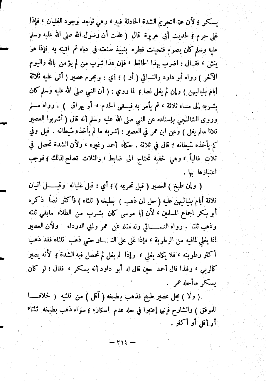 لِحَدِيثِ أَبِي هُرَيْرَةَ قَالَ «عَلِمْتُ أَنَّ رَسُولَ اللَّهِ - صَلَّى اللَّهُ عَلَيْهِ وَسَلَّمَ - كَانَ يَصُومُ فَتَحَيَّنْتُ فِطْرَهُ بِنَبِيذٍ صَنَعْتُهُ فِي دُبَّاءَ ثُمَّ أَتَيْتُهُ بِهِ، فَإِذَا هُوَ يَنِشُّ، فَقَالَ: اضْرِبْ بِهَذَا الْحَائِطَ، فَإِنَّ هَذَا شُرْبُ مَنْ لَمْ يُؤْمِنْ بِاَللَّهِ وَالْيَوْمِ الْآخِرِ» ) رَوَاهُ أَبُو دَاوُد وَالنَّسَائِيُّ (أَوْ) ؛ أَيْ: وَيَحْرُمُ عَصِيرٌ (أَتَى عَلَيْهِ ثَلَاثَةُ أَيَّامٍ بِلَيَالِيِهِنَّ) وَإِنْ لَمْ يُغْلَ نَصًّا؛ لِمَا رُوِيَ: «أَنَّ النَّبِيَّ - صَلَّى اللَّهُ عَلَيْهِ وَسَلَّمَ - كَانَ يَشْرَبُهُ إلَى مَسَاءِ ثَلَاثَةٍ، ثُمَّ يَأْمُرُ بِهِ فَيُسْقَى الْخَدَمَ، أَوْ يُهْرَاقُ» ) رَوَاهُ مُسْلِمٌ وَرَوَى الشَّالَنْجِيُّ بِإِسْنَادِهِ عَنْ النَّبِيِّ - صَلَّى اللَّهُ عَلَيْهِ وَسَلَّمَ - أَنَّهُ قَالَ «اشْرَبُوا الْعَصِيرَ ثَلَاثَةً مَا لَمْ يَغْلِ» ) وَعَنْ ابْنِ عُمَرَ فِي الْعَصِيرِ: أَشْرَبُهُ مَا لَمْ يَأْخُذْهُ شَيْطَانُهُ. قِيلَ وَفِي كَمْ يَأْخُذُهُ شَيْطَانُهُ؟ قَالَ فِي ثَلَاثَةٍ. حَكَاهُ أَحْمَدُ وَغَيْرُهُ، وَلِأَنَّ الشِّدَّةَ تَحْصُلُ فِي ثَلَاثٍ غَالِبًا، وَهِيَ خَفِيَّةٌ تَحْتَاجُ إلَى ضَابِطٍ، وَالثَّلَاثُ تَصْلُحُ لِذَلِكَ؛ فَوَجَبَ اعْتِبَارُهَا بِهَا.