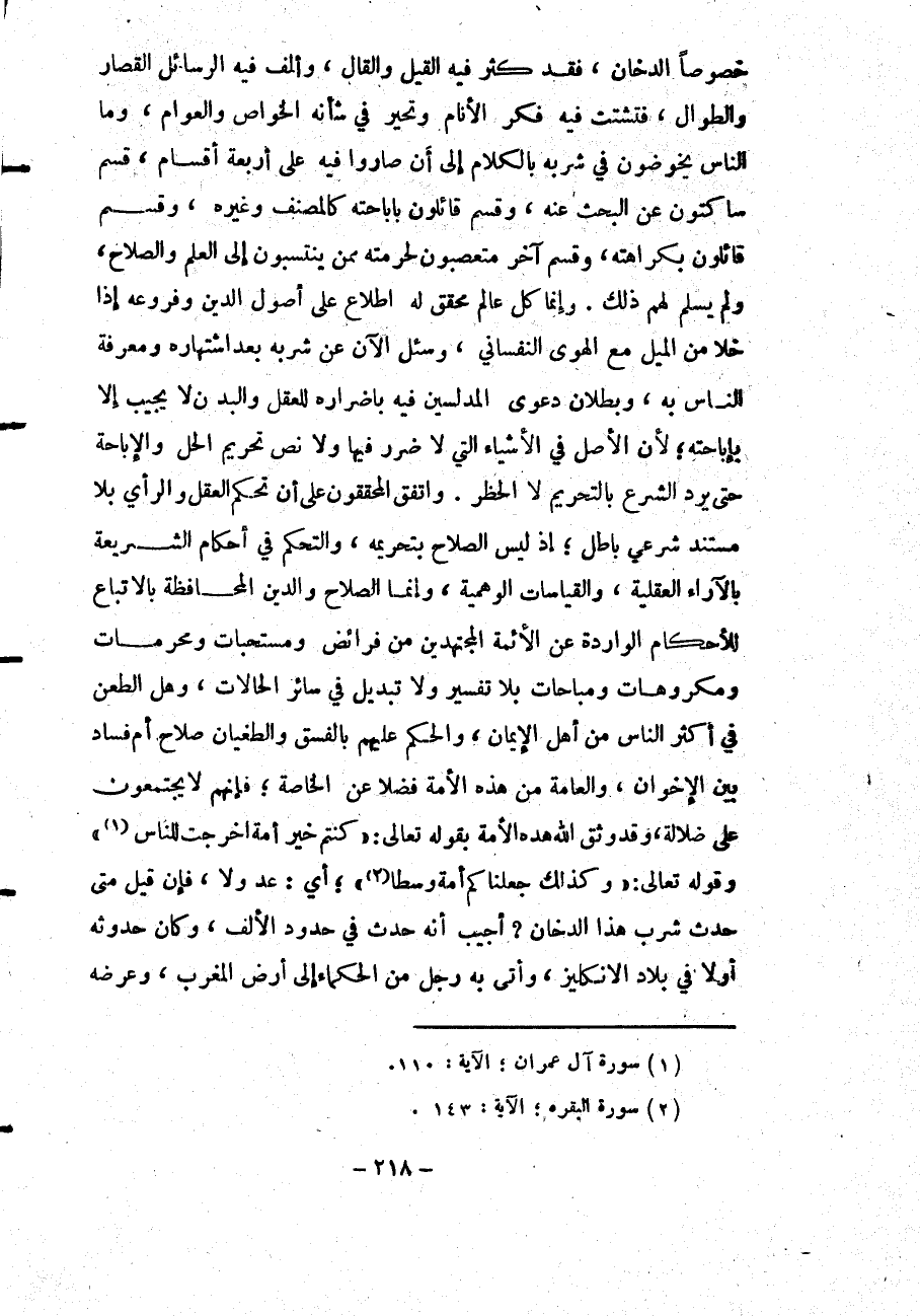 وَقَدْ وَثَّقَ اللَّهُ هَذِهِ الْأُمَّةَ بِقَوْلِهِ تَعَالَى: {كُنْتُمْ خَيْرَ أُمَّةٍ أُخْرِجَتْ لِلنَّاسِ} [آل عمران: 110] وقَوْله تَعَالَى: {وَكَذَلِكَ جَعَلْنَاكُمْ أُمَّةً وَسَطًا} [البقرة: 143] ؛ أَيْ: عُدُولًا، فَإِنْ قِيلَ مَتَى حَدَثَ شُرْبُ هَذَا الدُّخَانَ؟ أُجِيبُ أَنَّهُ حَدَثَ فِي حُدُودِ الْأَلْفِ، وَكَانَ حُدُوثُهُ أَوَّلًا فِي بِلَادِ الْإِنْكِلِيزِ، وَأَتَى بِهِ رَجُلٌ مِنْ الْحُكَمَاءِ إلَى أَرْضِ الْمَغْرِبِ، وَعَرَضَهُ