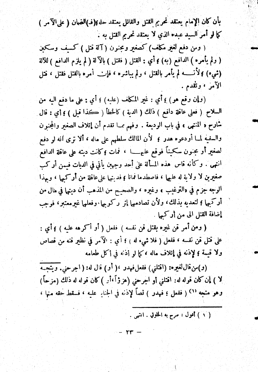 (وَمَنْ دَفَعَ لِغَيْرِ مُكَلَّفٍ) كَصَغِيرٍ، وَمَجْنُونٍ (آلَةَ قَتْلٍ) كَسَيْفٍ، وَسِكِّينٍ (وَلَمْ يَأْمُرْهُ) الدَّافِعُ (بِهِ) ؛ أَيْ: الْقَتْلِ (فَقَتَلَ) بِالْآلَةِ (لَمْ يَلْزَمْ الدَّافِعَ) لِلْآلَةِ (شَيْءٌ) ؛ لِأَنَّهُ لَمْ يَأْمُرْ بِالْقَتْلِ، وَلَمْ يُبَاشِرْهُ، فَإِنْ أَمَرَهُ بِالْقَتْلِ فَقَتَلَ، قُتِلَ الْآمِرُ، وَتَقَدَّمَ.