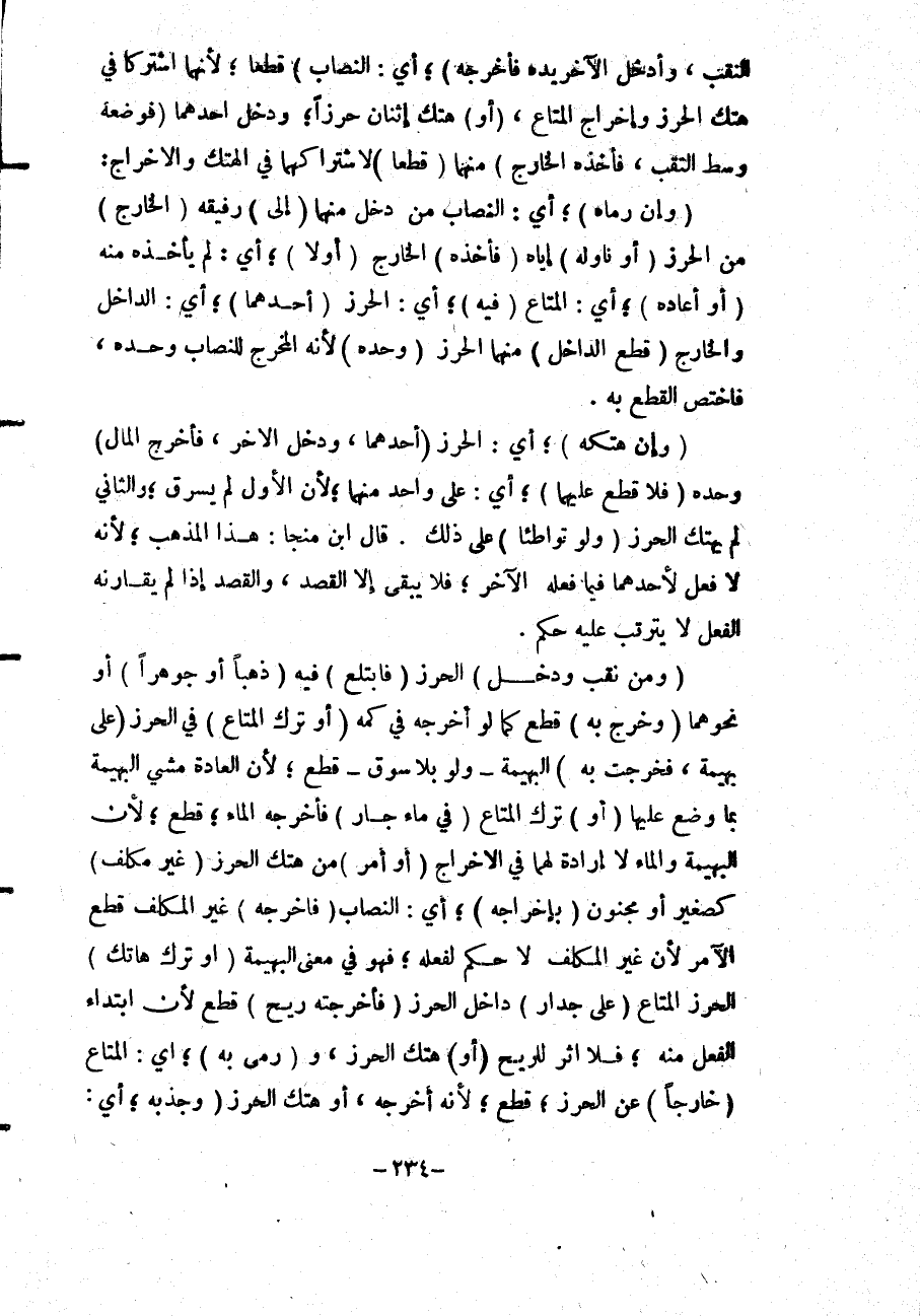 النَّقْبِ، وَأَدْخَلَ الْآخَرُ يَدَهُ فَأَخْرُجَهُ) ؛ أَيْ: النِّصَابَ قُطِعَا؛ لِأَنَّهُمَا ااشْتَرَكَا فِي هَتْكِ الْحِرْزِ وَإِخْرَاجِ الْمَتَاعِ، (أَوْ) هَتَكَ اثْنَانِ حِرْزًا؛ وَدَخَلَ أَحَدُهُمَا (فَوَضَعَهُ وَسَطَ النَّقْبِ، فَأَخَذَهُ الْخَارِجُ) مِنْهُمَا (قُطِعَا) لِاشْتِرَاكِهِمَا فِي الْهَتْكِ وَالْإِخْرَاجِ: (وَإِنْ رَمَاهُ) ؛ أَيْ: النِّصَابَ مَنْ دَخَلَ مِنْهُمَا (إلَى) رَفِيقِهِ (الْخَارِجِ) مِنْ الْحِرْزِ (أَوْ نَاوَلَهُ) إيَّاهُ (فَأَخَذَهُ) الْخَارِجُ (أَوَّلًا) ؛ أَيْ: لَمْ يَأْخُذْهُ مِنْهُ (أَوْ أَعَادَهُ) ؛ أَيْ: الْمَتَاعَ (فِيهِ) ؛ أَيْ: الْحِرْزِ (أَحَدُهُمَا) ؛ أَيْ: الدَّاخِلِ وَالْخَارِجِ (قُطِعَ الدَّاخِلُ) مِنْهُمَا الْحِرْزَ (وَحْدَهُ) لِأَنَّهُ الْمُخْرِجُ لِلنِّصَابِ وَحْدَهُ، فَاخْتَصَّ الْقَطْعُ بِهِ.