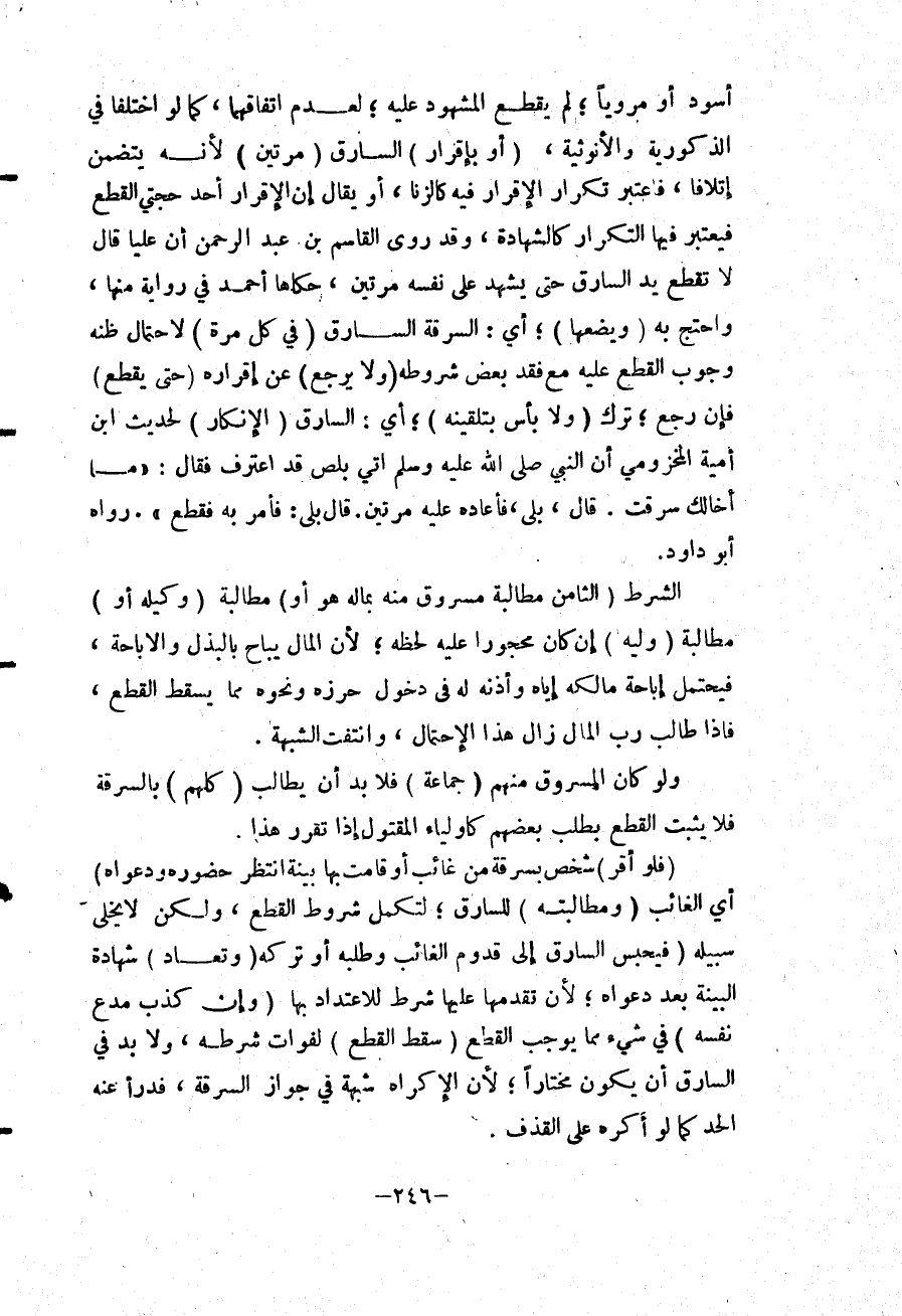 الشَّرْطُ (الثَّامِنُ مُطَالَبَةُ مَسْرُوقٍ مِنْهُ بِمَالِهِ هُوَ أَوْ) مُطَالَبَةُ (وَكِيلِهِ أَوْ) مُطَالَبَةُ (وَلِيِّهِ) إنْ كَانَ مَحْجُورًا عَلَيْهِ لِحَظِّهِ؛ لِأَنَّ الْمَالَ يُبَاحُ بِالْبَذْلِ وَالْإِبَاحَةِ، فَيُحْتَمَلُ إبَاحَةُ مَالِكِهِ إيَّاهُ وَإِذْنُهُ لَهُ فِي دُخُولِ حِرْزِهِ وَنَحْوِهِ مِمَّا يُسْقِطُ الْقَطْعَ، فَإِذَا طَالَبَ رَبُّ الْمَالِ زَالَ هَذَا الِاحْتِمَالُ، وَانْتَفَتْ الشُّبْهَةُ.