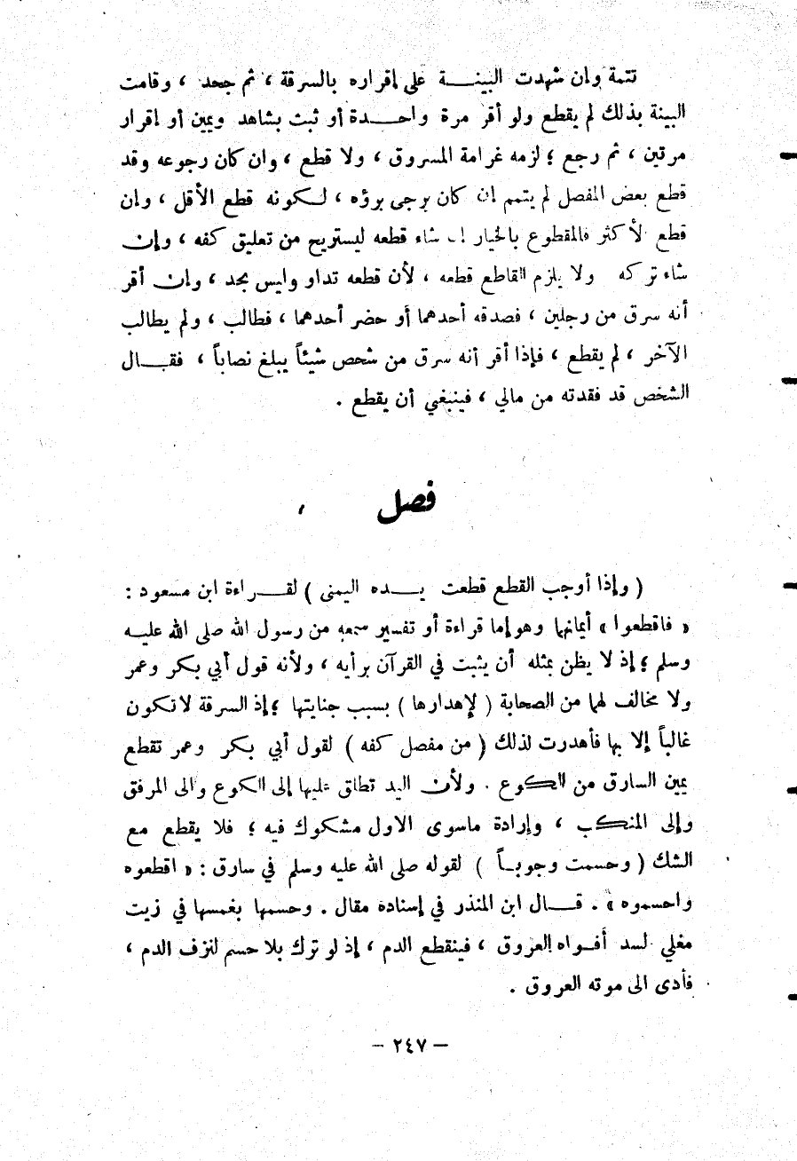 فَصْلٌ (وَإِذَا أُوجِبَ الْقَطْعُ قُطِعَتْ يَدُهُ الْيُمْنَى) لِقِرَاءَةِ ابْنِ مَسْعُودٍ: " فَاقْطَعُوا " أَيْمَانَهُمَا وَهُوَ إمَّا قِرَاءَةٌ أَوْ تَفْسِيرٌ سَمِعَهُ مِنْ رَسُولِ اللَّهِ - صَلَّى اللَّهُ عَلَيْهِ وَسَلَّمَ -؛ إذْ لَا يُظَنُّ بِمِثْلِهِ أَنْ يُثْبِتَ فِي الْقُرْآنِ بِرَأْيِهِ، وَلِأَنَّهُ قَوْلُ أَبِي بَكْرٍ وَعُمَرَ وَلَا مُخَالِفَ لَهُمَا مِنْ الصَّحَابَةِ (لِإِهْدَارِهَا) بِسَبَبِ جِنَايَتِهَا؛ إذْ السَّرِقَةُ لَا تَكُونُ غَالِبًا إلَّا بِهَا فَأُهْدِرَتْ لِذَلِكَ (مِنْ مِفْصَلِ كَفِّهِ) لِقَوْلِ أَبِي بَكْرٍ وَعُمَرَ تُقْطَعُ يَمِينُ السَّارِقِ مِنْ الْكُوعِ وَلِأَنَّ الْيَدَ تُطْلَقُ عَلَيْهَا إلَى الْكُوعِ وَإِلَى الْمِرْفَقِ وَإِلَى الْمَنْكِبِ، وَإِرَادَةُ مَا سِوَى الْأَوَّلِ مَشْكُوكٌ فِيهِ؛ فَلَا يُقْطَعُ مَعَ الشَّكِّ.