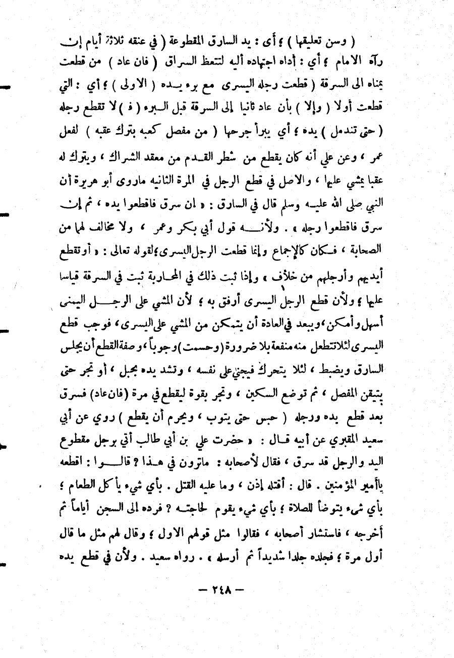 رُوِيَ عَنْ أَبِي سَعِيدٍ الْمَقْبُرِيِّ عَنْ أَبِيهِ قَالَ: " حَضَرْت عَلِيَّ بْنَ أَبِي طَالِبٍ أُتِيَ بِرَجُلٍ مَقْطُوعِ الْيَدِ وَالرِّجْلِ قَدْ سَرَقَ، فَقَالَ لِأَصْحَابِهِ: مَا تَرَوْنَ فِي هَذَا؟ قَالُوا: اقْطَعْهُ يَا أَمِيرَ الْمُؤْمِنِينَ قَالَ: أَقْتُلُهُ إذَنْ، وَمَا عَلَيْهِ الْقَتْلُ بِأَيِّ شَيْءٍ يَأْكُلُ الطَّعَامَ؛ بِأَيِّ شَيْءٍ يَتَوَضَّأُ لِلصَّلَاةِ؛ بِأَيِّ شَيْءٍ يَقُومُ لِحَاجَتِهِ؟ فَرَدَّهُ إلَى السِّجْنِ أَيَّامًا ثُمَّ أَخْرَجَهُ، فَاسْتَشَارَ أَصْحَابَهُ، فَقَالُوا مِثْلَ قَوْلِهِمْ الْأَوَّلِ؛ وَقَالَ لَهُمْ مِثْلَ مَا قَالَ أَوَّلَ مَرَّةٍ؛ فَجَلَدَهُ جَلْدًا شَدِيدًا ثُمَّ أَرْسَلَهُ ". رَوَاهُ سَعِيدٌ.