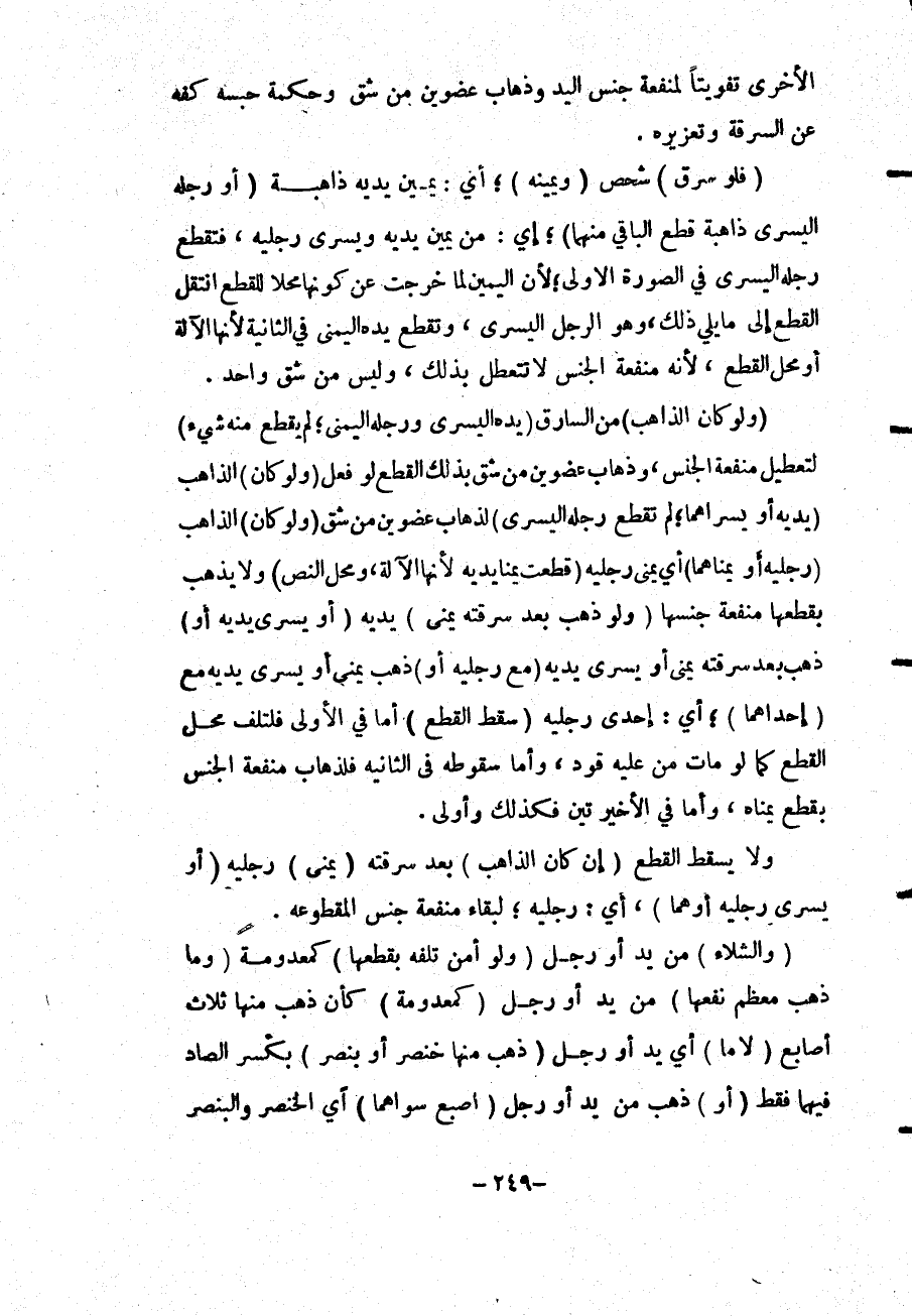 الْأُخْرَى تَفْوِيتًا لِمَنْفَعَةِ جِنْسِ الْيَدِ وَذَهَابِ عُضْوَيْنِ مِنْ شِقٍّ وَحِكْمَةُ حَبْسِهِ كَفُّهُ عَنْ السَّرِقَةِ وَتَعْزِيرُهُ.