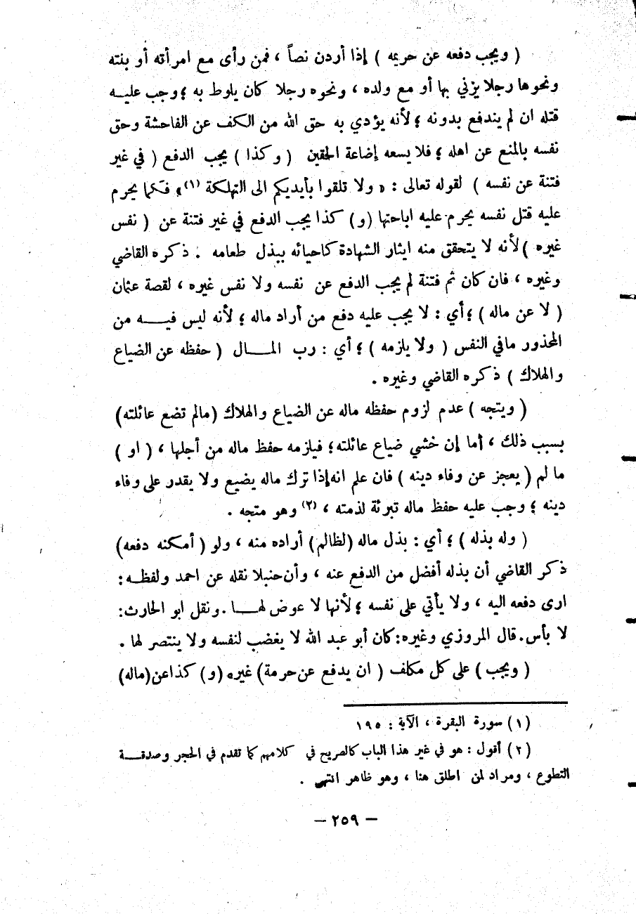 (وَيَجِبُ دَفْعُهُ عَنْ حَرِيمِهِ) إذَا أَرَدْنَ نَصًّا، فَمَنْ رَأَى مَعَ امْرَأَتِهِ أَوْ بِنْتِهِ وَنَحْوِهَا رَجُلًا يَزْنِي بِهَا أَوْ مَعَ وَلَدِهِ، وَنَحْوِهِ رَجُلًا كَانَ يَلُوطُ بِهِ؛ وَجَبَ عَلَيْهِ قَتْلُهُ إنْ لَمْ يَنْدَفِعْ بِدُونِهِ؛ لِأَنَّهُ يُؤَدِّي بِهِ حَقَّ اللَّهِ مِنْ الْكَفِّ عَنْ الْفَاحِشَةِ وَحَقَّ نَفْسِهِ بِالْمَنْعِ عَنْ أَهْلِهِ؛ فَلَا يَسَعُهُ إضَاعَةُ الْحَقَّيْنِ (وَكَذَا) يَجِبُ الدَّفْعُ (فِي غَيْرِ فِتْنَةٍ عَنْ نَفْسِهِ) لِقَوْلِهِ تَعَالَى: {وَلا تُلْقُوا بِأَيْدِيكُمْ إِلَى التَّهْلُكَةِ} [البقرة: 195] فَكَمَا يَحْرُمُ عَلَيْهِ قَتْلُ نَفْسِهِ يَحْرُمُ عَلَيْهِ إبَاحَتُهَا (وَ) كَذَا يَجِبُ الدَّفْعُ فِي غَيْرِ فِتْنَةٍ عَنْ (نَفْسِ غَيْرِهِ) ؛ لِأَنَّهُ لَا يَتَحَقَّقُ مِنْهُمْ إيثَارُ الشَّهَادَةِ كَإِحْيَائِهِ بِبَذْلِ طَعَامِهِ.