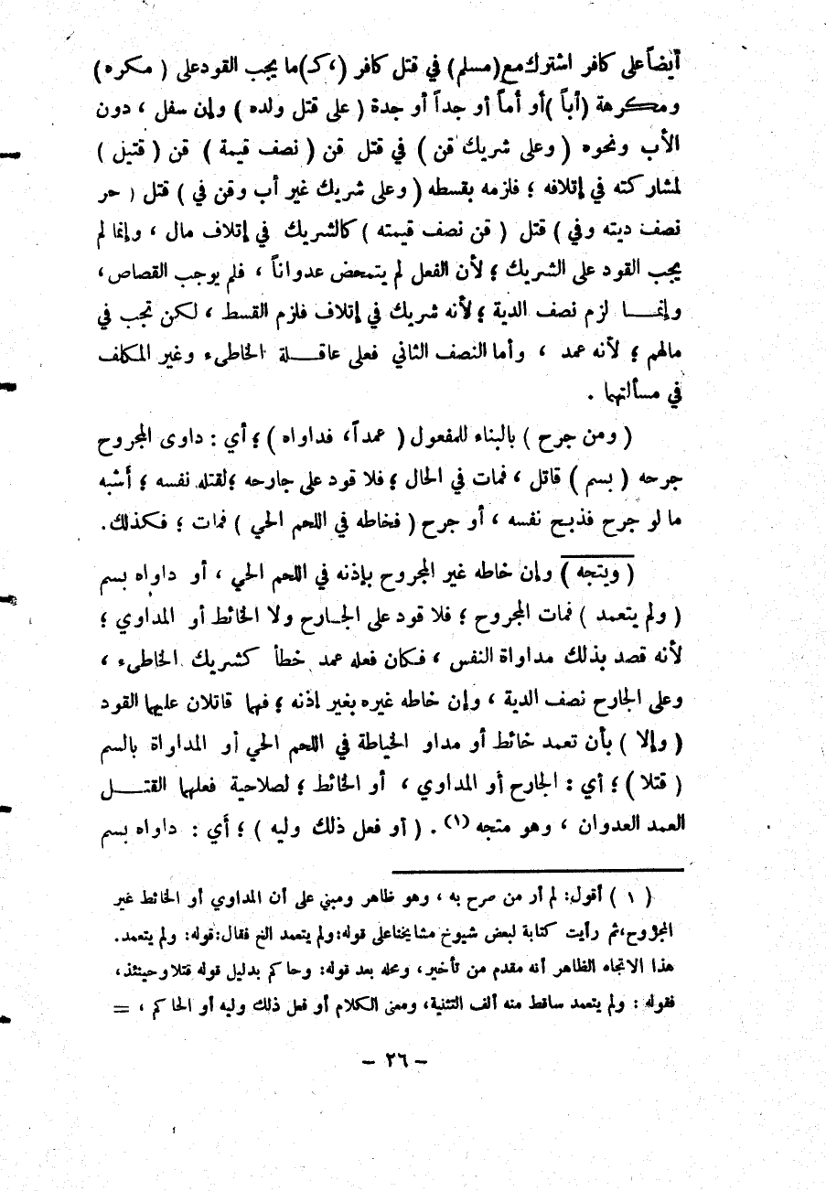 أَيْضًا عَلَى كَافِرٍ اشْتَرَكَ مَعَ (مُسْلِمٍ) فِي قَتْلِ كَافِرٍ (كَ) مَا يَجِبُ الْقَوَدُ عَلَى (مُكْرَهٍ) ، وَمُكْرَهَةٍ (أَبًا) أَوْ أُمًّا أَوْ جَدًّا أَوْ جَدَّةً (عَلَى قَتْلِ وَلَدِهِ) ، وَإِنْ سَفَلَ، دُونَ الْأَبِ، وَنَحْوِهِ (وَعَلَى شَرِيكِ قِنٍّ) فِي قَتْلِ قِنٍّ (نِصْفُ قِيمَةِ) قِنٍّ (قَتِيلٍ) لِمُشَارَكَتِهِ فِي إتْلَافِهِ؛ فَلَزِمَهُ بِقِسْطِهِ (وَعَلَى شَرِيكِ غَيْرِ أَبٍ، وَقِنٍّ فِي) قَتْلِ (حُرٍّ نِصْفُ دِيَتِهِ، وَفِي) قَتْلِ (قِنٍّ نِصْفُ قِيمَتِهِ) كَالشَّرِيكِ فِي إتْلَافِ مَالٍ، وَإِنَّمَا لَمْ يَجِبْ الْقَوَدُ عَلَى الشَّرِيكِ؛ لِأَنَّ الْفِعْلَ لَمْ يَتَمَحَّضْ عُدْوَانًا، فَلَمْ يُوجِبْ الْقِصَاصَ، وَإِنَّمَا لَزِمَ نِصْفُ الدِّيَةِ؛ لِأَنَّهُ شَرِيكٌ فِي إتْلَافٍ فَلَزِمَ الْقِسْطُ، لَكِنْ تَجِبُ فِي مَالِهِمْ؛ لِأَنَّهُ عَمْدٌ، وَأَمَّا النِّصْفُ الثَّانِي فَعَلَى عَاقِلَةِ الْخَاطِئِ، وَغَيْرِ الْمُكَلَّفِ فِي مَسْأَلَتِهِمَا.