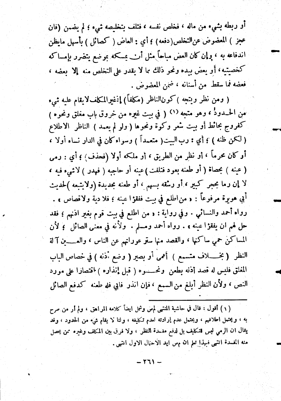 (وَمَنْ نَظَرَ وَيَتَّجِهُ) كَوْنُ النَّاظِرِ (مُكَلَّفًا) إذْ غَيْرُ الْمُكَلَّفِ لَا يُقَامُ عَلَيْهِ شَيْءٌ مِنْ الْحُدُودِ، وَهُوَ مُتَّجِهٌ (فِي بَيْتِ غَيْرِهِ مِنْ خُرُوقِ بَابٍ مُغْلَقٍ وَنَحْوِهِ) كَفُرُوجٍ بِحَائِطٍ أَوْ بَيْتِ شَعْرٍ وَكُوَّةٍ وَنَحْوِهَا (وَلَوْ لَمْ يَعْمِدْ) النَّاظِرُ الِاطِّلَاعَ (لَكِنْ ظَنَّهُ) ؛ أَيْ: رَبُّ الْبَيْتِ (مُتَعَمِّدًا) وَسَوَاءٌ كَانَ فِي الدَّارِ نِسَاءٌ أَوْ لَا، أَوْ كَانَ مَحْرَمًا، أَوْ نَظَرَ مِنْ الطَّرِيقِ، أَوْ مِلْكِهِ أَوْ لَا (فَحَذَفَ) ؛ أَيْ: رَمَى (عَيْنَهُ) بِحَصَاةٍ (أَوْ طَعَنَهُ بِعُودٍ فَتَلِفَتْ) عَيْنُهُ أَوْ حَاجِبُهُ (فَهَدَرٌ) لَا شَيْءَ فِيهِ، لَا إنْ رَمَى بِحَجَرٍ كَبِيرٍ، أَوْ رَشَقَهُ بِسَهْمٍ، أَوْ طَعَنَهُ بِحَدِيدَةٍ (وَلَا يَتْبَعُهُ) لِحَدِيثِ أَبِي هُرَيْرَةَ مَرْفُوعًا: «مَنْ اطَّلَعَ فِي بَيْتٍ فَفَقَئُوا عَيْنَهُ؛ فَلَا دِيَةَ وَلَا قِصَاصَ» . رَوَاهُ أَحْمَدُ وَالنَّسَائِيُّ. وَفِي رِوَايَةٍ: «مَنْ اطَّلَعَ فِي بَيْتِ قَوْمٍ بِغَيْرِ إذْنِهِمْ؛ فَقَدْ حَلَّ لَهُمْ أَنْ يَفْقَئُوا عَيْنَهُ» . رَوَاهُ أَحْمَدُ وَمُسْلِمٌ.