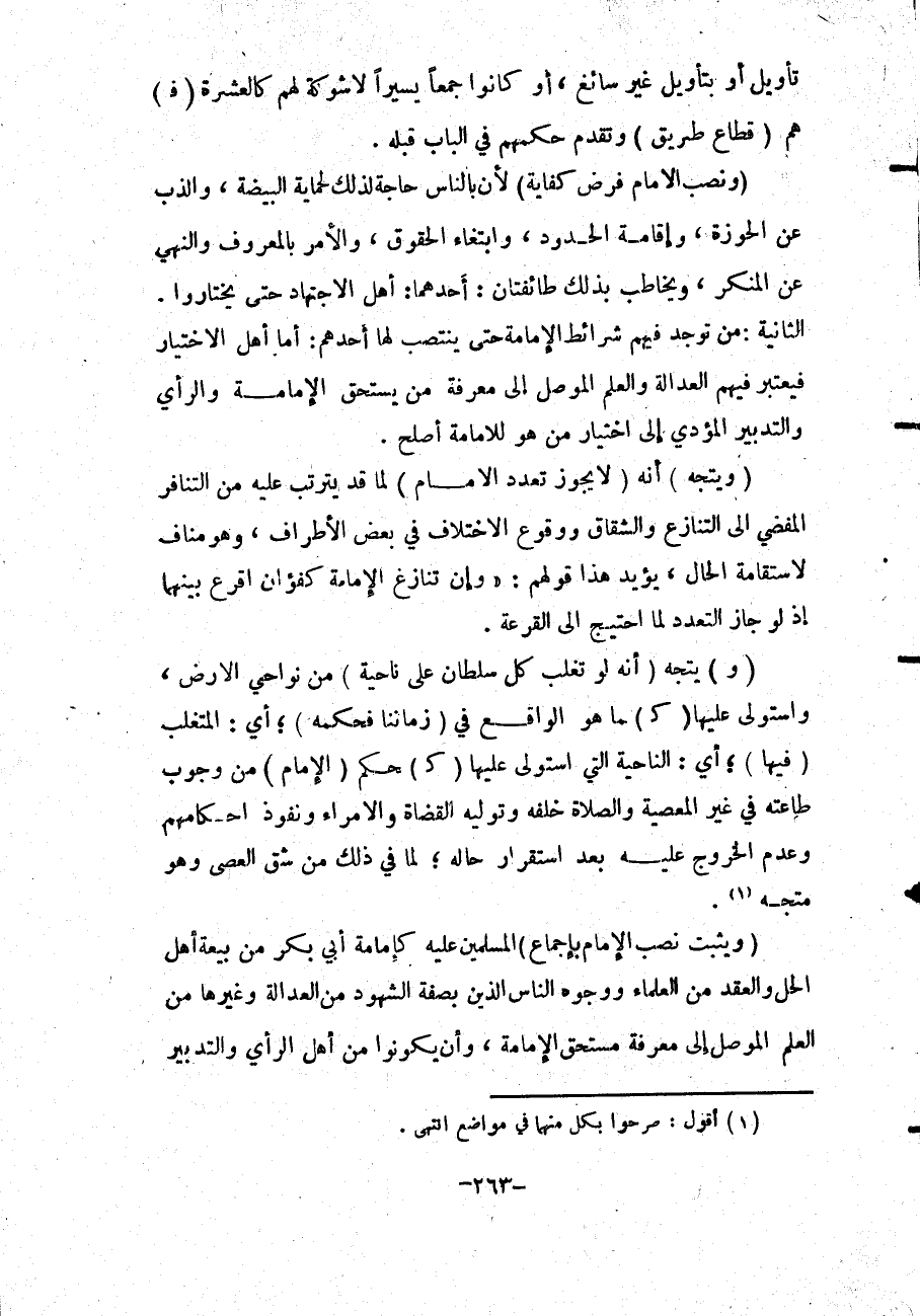 (وَنَصْبُ الْإِمَامِ فَرْضُ كِفَايَةٍ) ؛ لِأَنَّ بِالنَّاسِ حَاجَةً لِذَلِكَ لِحِمَايَةِ الْبَيْضَةِ، وَالذَّبِّ عَنْ الْحَوْزَةِ، وَإِقَامَةِ الْحُدُودِ، وَابْتِغَاءِ الْحُقُوقِ، وَالْأَمْرِ بِالْمَعْرُوفِ وَالنَّهْيِ عَنْ الْمُنْكَرِ، وَيُخَاطَبُ بِذَلِكَ طَائِفَتَانِ: أَحَدُهُمَا: أَهْلُ الِاجْتِهَادِ حَتَّى يَخْتَارُوا.