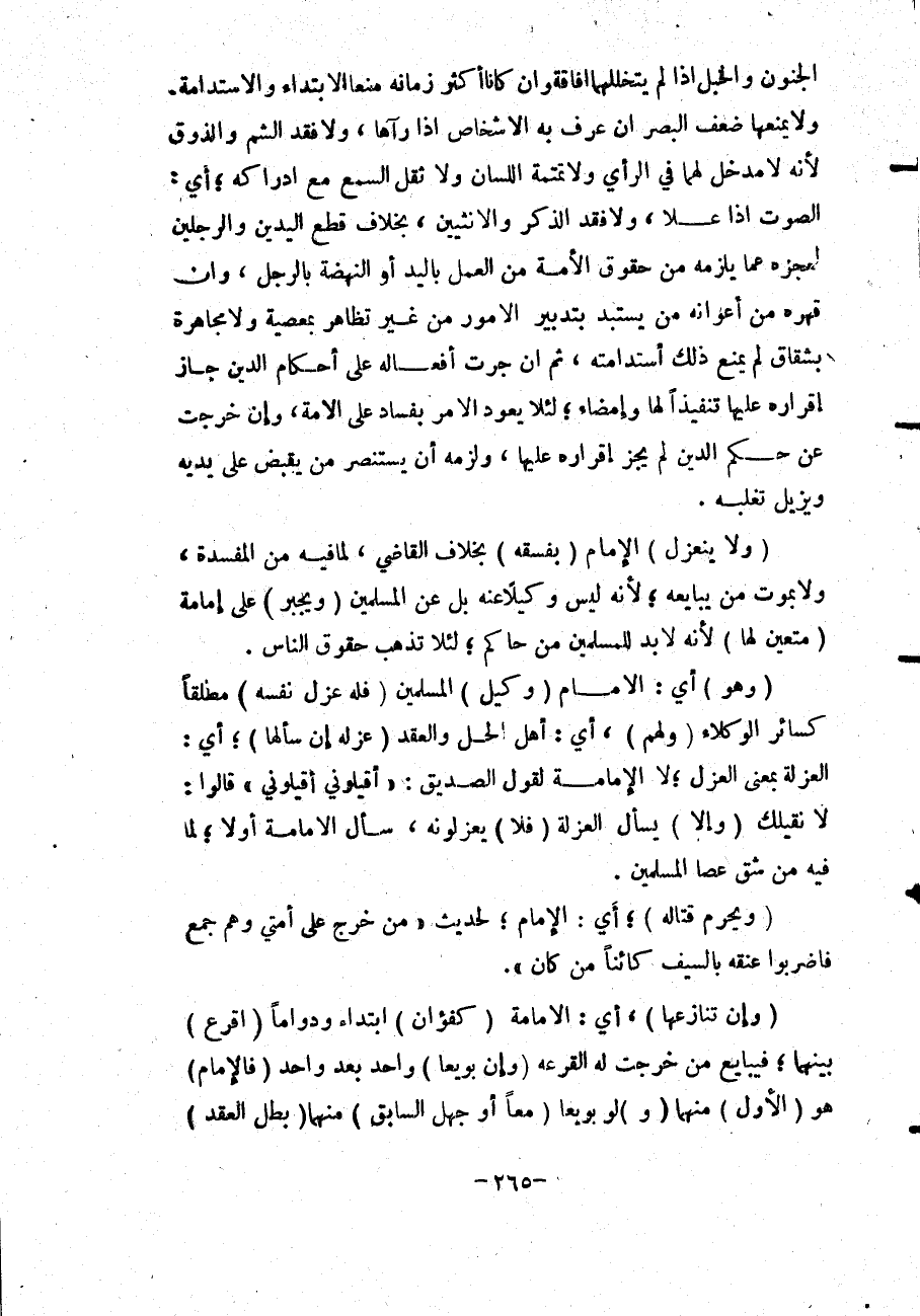 وَلَا يَمْنَعُهَا ضَعْفُ الْبَصَرِ إنْ عَرَفَ بِهِ الْأَشْخَاصَ إذَا رَآهَا، وَلَا فَقْدُ الشَّمِّ وَالذَّوْقِ لِأَنَّهُ لَا مَدْخَلَ لَهُمَا فِي الرَّأْيِ وَلَا تَمْتَمَةُ اللِّسَانِ وَلَا ثِقْلُ السَّمْعِ مَعَ إدْرَاكِهِ؛ أَيْ: الصَّوْتِ إذَا عَلَا، وَلَا فَقْدُ الذَّكَرِ وَالْأُنْثَيَيْنِ، بِخِلَافِ قَطْعِ الْيَدَيْنِ وَالرِّجْلَيْنِ لِعَجْزِهِ عَمَّا يَلْزَمُهُ مِنْ حُقُوقِ الْأُمَّةِ مِنْ الْعَمَلِ بِالْيَدِ أَوْ النَّهْضَةِ بِالرِّجْلِ، وَإِنْ قَهَرَهُ مِنْ أَعْوَانِهِ مَنْ يَسْتَبِدُّ بِتَدْبِيرِ الْأُمُورِ مِنْ غَيْرِ تَظَاهُرٍ بِمَعْصِيَةٍ وَلَا مُجَاهَرَةٍ بِشِقَاقٍ لَمْ يَمْنَعْ ذَلِكَ اسْتِدَامَتَهُ، ثُمَّ إنْ جَرَتْ أَفْعَالُهُ عَلَى أَحْكَامِ الدِّينِ جَازَ إقْرَارُهُ عَلَيْهَا تَنْفِيذًا لَهَا وَإِمْضَاءً؛ لِئَلَّا يَعُودَ الْأَمْرُ بِفَسَادٍ عَلَى الْأُمَّةِ وَإِنْ خَرَجَتْ عَنْ حُكْمِ الدِّينِ لَمْ يَجُزْ إقْرَارُهُ عَلَيْهَا، وَلَزِمَهُ أَنْ يَسْتَنْصِرَ مَنْ يَقْبِضُ عَلَى يَدَيْهِ وَيُزِيلُ تَغَلُّبَهُ.