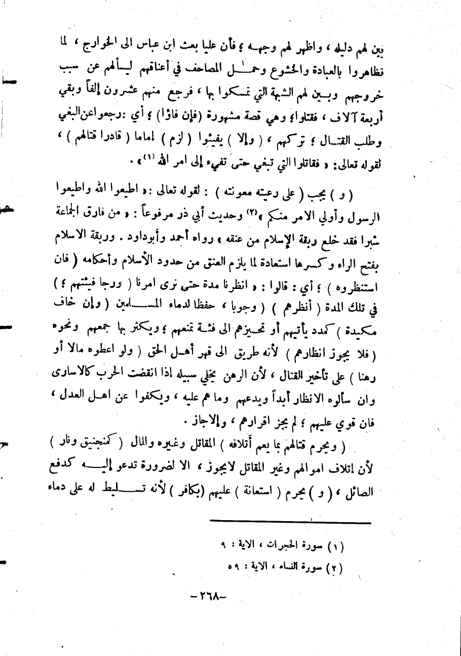 بَيَّنَ لَهُمْ دَلِيلَهُ، وَأَظْهَرَ لَهُمْ وَجْهَهُ؛ فَإِنَّ عَلِيًّا بَعَثَ ابْنَ عَبَّاسٍ إلَى الْخَوَارِجِ، لَمَّا تَظَاهَرُوا بِالْعِبَادَةِ وَالْخُشُوعِ وَحَمْلِ الْمَصَاحِفِ فِي أَعْنَاقِهِمْ لِيَسْأَلَهُمْ عَنْ سَبَبِ خُرُوجِهِمْ وَبَيَّنَ لَهُمْ الشُّبْهَةَ الَّتِي تَمَسَّكُوا بِهَا، فَرَجَعَ مِنْهُمْ عِشْرُونَ أَلْفًا وَبَقِيَ أَرْبَعَةُ آلَافٍ، فَقُتِلُوا؛ وَهِيَ قِصَّةٌ مَشْهُورَةٌ (فَإِنْ فَاءُوا) ؛ أَيْ: رَجَعُوا عَنْ الْبَغْيِ وَطَلَبِ الْقِتَالِ؛ تَرَكَهُمْ، (وَإِلَّا) يَفِيئُوا (لَزِمَ) إمَامًا (قَادِرًا قِتَالُهُمْ) لِقَوْلِهِ تَعَالَى: {فَقَاتِلُوا الَّتِي تَبْغِي حَتَّى تَفِيءَ إِلَى أَمْرِ اللَّهِ} [الحجرات: 9] .