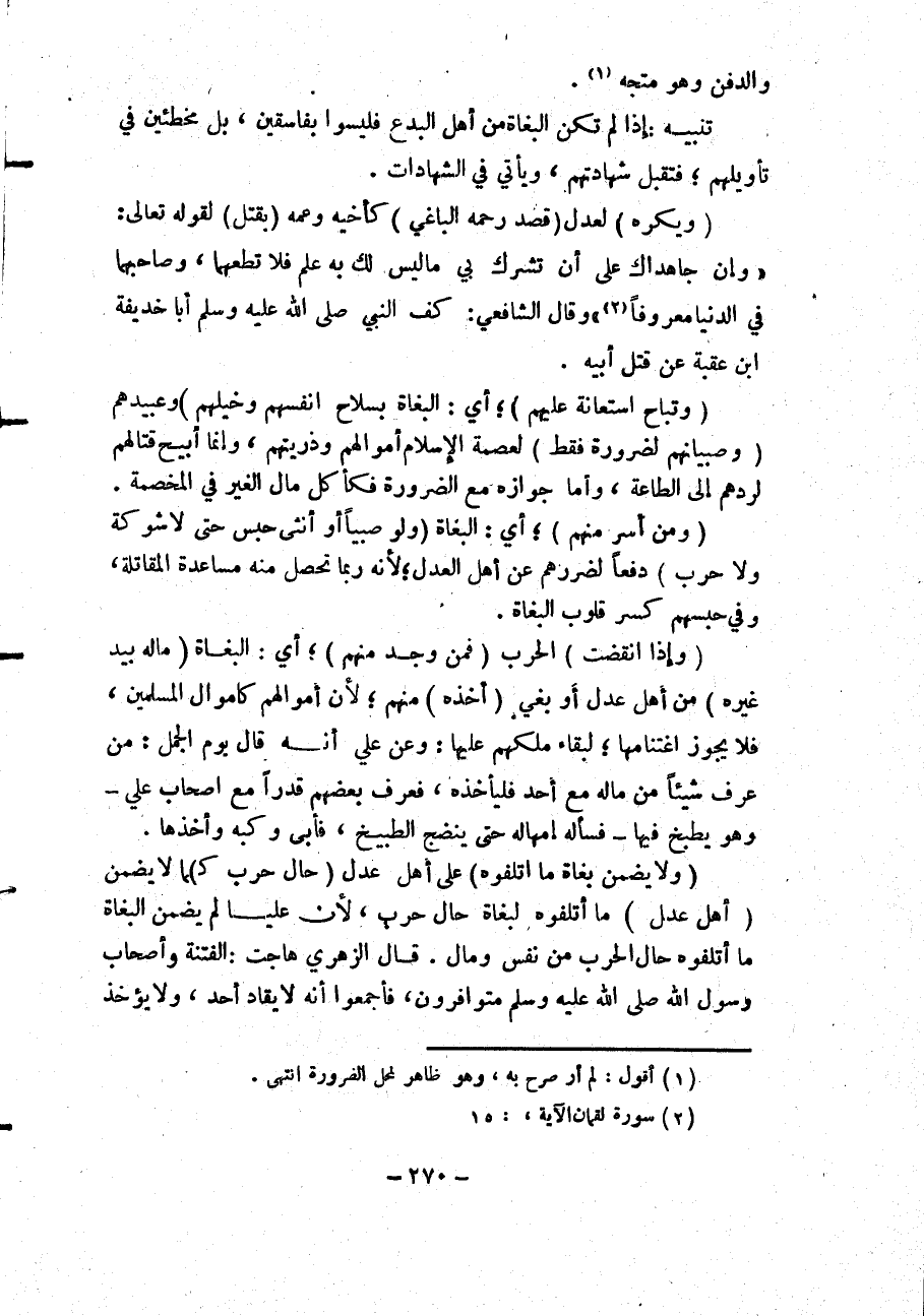 (وَيُكْرَهُ) لِعَدْلٍ (قَصْدُ رَحِمِهِ الْبَاغِي) كَأَخِيهِ وَعَمِّهِ (بِقَتْلٍ) لِقَوْلِهِ تَعَالَى: {وَإِنْ جَاهَدَاكَ عَلَى أَنْ تُشْرِكَ بِي مَا لَيْسَ لَكَ بِهِ عِلْمٌ فَلا تُطِعْهُمَا وَصَاحِبْهُمَا فِي الدُّنْيَا مَعْرُوفًا} [لقمان: 15] وَقَالَ الشَّافِعِيُّ: «كَفَّ النَّبِيُّ - صَلَّى اللَّهُ عَلَيْهِ وَسَلَّمَ - أَبَا حُذَيْفَةَ بْنَ عُقْبَةَ عَنْ قَتْلِ أَبِيهِ» .