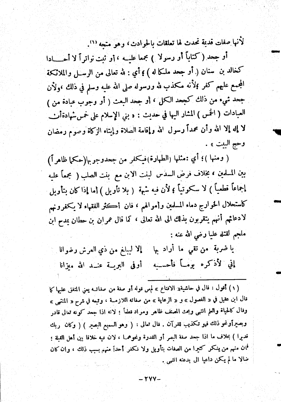 (وَمِنْهَا) ؛ أَيْ: مِثْلُهَا (الطَّهَارَةُ) فَيُكَفَّرُ مَنْ جَحَدَ وُجُوبَهَا (حُكْمًا ظَاهِرًا) بَيْنَ الْمُسْلِمِينَ، بِخِلَافِ فَرْضِ السُّدُسِ لِبِنْتِ الِابْنِ مَعَ بِنْتِ الصُّلْبِ (مُجْمَعًا عَلَيْهِ إجْمَاعًا قَطْعِيًّا) لَا سُكُوتِيًّا؛ لِأَنَّ فِيهِ شُبْهَةً (بِلَا تَأْوِيلٍ) أَمَّا إذَا كَانَ بِتَأْوِيلٍ كَاسْتِحْلَالِ الْخَوَارِجِ دِمَاءَ الْمُسْلِمِينَ وَأَمْوَالَهُمْ، فَإِنَّ أَكْثَرَ الْفُقَهَاءِ لَا يُكَفِّرُونَهُمْ لِادِّعَائِهِمْ أَنَّهُمْ يَتَقَرَّبُونَ بِذَلِكَ إلَى اللَّهِ تَعَالَى، كَمَا قَالَ: عُمْرَانِ بْن حِطَّانَ يَمْدَحُ ابْنَ مُلْجِمٍ لِقَتْلِهِ عَلِيًّا - رَضِيَ اللَّهُ عَنْهُ -: