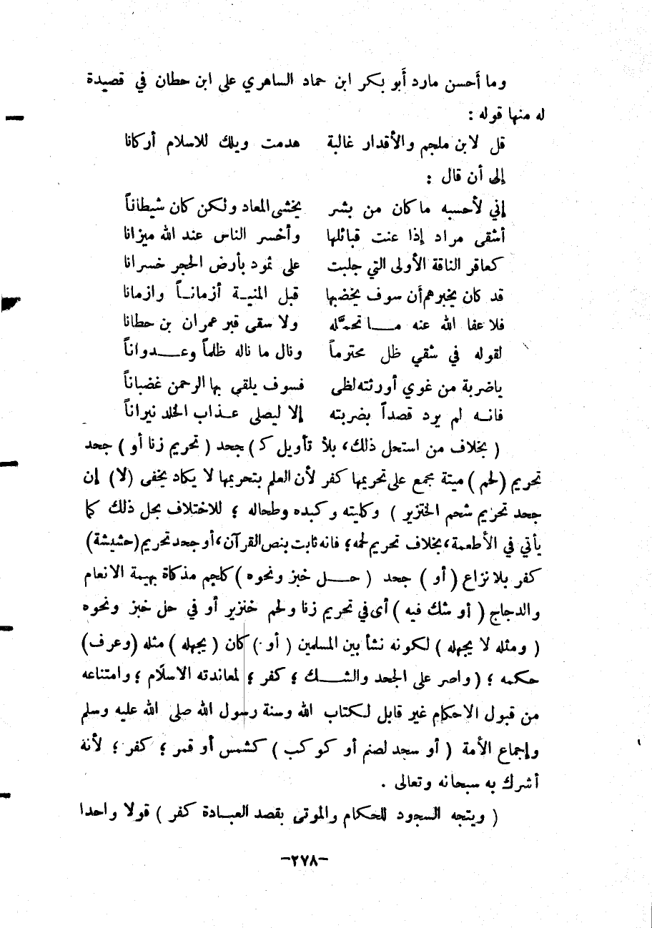 وَمَا أَحْسَنَ مَا رَدَّ أَبُو بَكْرِ بْنُ حَمَّادٍ السَّاهِرِيُّ، عَلَى ابْنِ حِطَّانَ فِي قَصِيدَةٍ لَهُ مِنْهَا قَوْلُهُ: