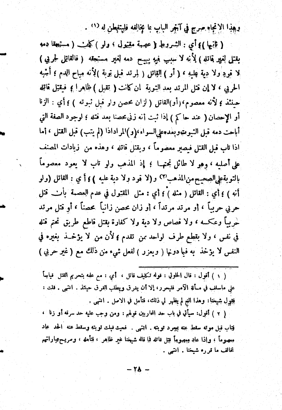 (ثَانِيهَا) أَيْ: الشُّرُوطِ (عِصْمَةُ مَقْتُولٍ، وَلَوْ) كَانَ (مُسْتَحَقًّا دَمُهُ بِقَتْلٍ لِغَيْرِ قَاتِلِهِ) ؛ لِأَنَّهُ لَا سَبَبَ فِيهِ يُبِيحُ دَمَهُ لِغَيْرِ مُسْتَحِقِّهِ (فَالْقَاتِلُ لِحَرْبِيٍّ) لَا قَوَدَ، وَلَا دِيَةَ عَلَيْهِ، (أَوْ) الْقَاتِلُ (لِمُرْتَدٍّ قَبْلَ تَوْبَةٍ) ؛ لِأَنَّهُ مُبَاحُ الدَّمِ؛ أَشْبَهَ الْحَرْبِيَّ، لَا إنْ قُتِلَ الْمُرْتَدُّ بَعْدَ التَّوْبَةِ إنْ كَانَتْ (تُقْبَلُ) ظَاهِرًا؛ فَيُقْتَلُ قَاتِلُهُ حِينَئِذٍ؛ لِأَنَّهُ مَعْصُومٌ، (أَوْ) الْقَاتِلُ (لِزَانٍ مُحْصَنٍ، وَلَوْ قَبْلَ ثُبُوتِهِ) ؛ أَيْ: الزِّنَا أَوْ الْإِحْصَانِ (عِنْدَ حَاكِمٍ) إذَا ثَبَتَ أَنَّهُ زَنَى مُحْصَنًا بَعْدَ قَتْلِهِ؛ لِوُجُودِ الصِّفَةِ الَّتِي أَبَاحَتْ دَمَهُ قَبْلَ الثُّبُوتِ، وَبَعْدَهُ عَلَى السَّوَاءِ، (وَ) الْمُرَادُ إذَا (لَمْ يَتُبْ) قَبْلَ الْقَتْلِ، أَمَّا إذَا تَابَ قَبْلَ الْقَتْلِ فَيَصِيرُ مَعْصُومًا، وَيُقْتَلُ قَاتِلُهُ، وَهَذِهِ مِنْ زِيَادَاتِ الْمُصَنِّفِ عَلَى أَصْلَيْهِ، وَهُوَ لَا طَائِلَ تَحْتَهَا؛ إذْ الْمَذْهَبُ، وَلَوْ تَابَ لَا يَعُودُ مَعْصُومًا بِالتَّوْبَةِ عَلَى الصَّحِيحِ مِنْ الْمَذْهَبِ.