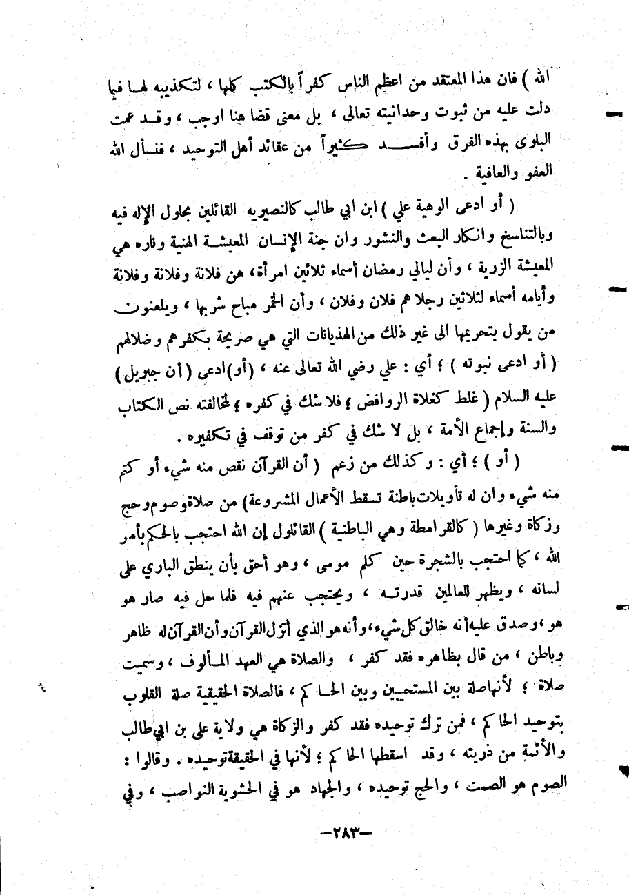 (أَوْ) ؛ أَيِّ: وَكَذَلِكَ مَنْ زَعَمَ (أَنْ الْقُرْآنَ نَقَصَ مِنْهُ شَيْءٌ أَوْ كُتِمَ مِنْهُ شَيْءٌ وَأَنَّ لَهُ تَأْوِيلَاتٌ بَاطِنَةٌ تُسْقِطُ الْأَعْمَالَ الْمَشْرُوعَةَ) مِنْ صَلَاةٍ وَصَوْمٍ وَحَجٍّ وَزَكَاةٍ وَغَيْرِهَا (كَالْقَرَامِطَةِ وَهِيَ الْبَاطِنِيَّةُ) الْقَائِلُونَ إنَّ اللَّهَ احْتَجَبَ بِالْحُكْمِ بِأَمْرِ اللَّهِ، كَمَا احْتَجَبَ بِالشَّجَرَةِ حِينَ كَلَّمَ مُوسَى، وَهُوَ أَحَقُّ بِأَنْ يَنْطِقَ الْبَارِّي عَلَى لِسَانِهِ، وَيُظْهِرُ لِلْعَالَمِينَ قُدْرَتَهُ، وَيَحْتَجِبُ عَنْهُمْ فِيهِ فَلَمَّا حَلَّ فِيهِ صَارَ هُوَ هُوَ، وَصَدَقَ عَلَيْهِ أَنَّهُ خَالِقُ كُلِّ شَيْءٍ، وَأَنَّهُ هُوَ الَّذِي أَنْزَلَ الْقُرْآنَ وَأَنَّ الْقُرْآنَ لَهُ ظَاهِرٌ وَبَاطِنٌ، مَنْ قَالَ: بِظَاهِرِهِ فَقَدْ كَفَرَ، وَالصَّلَاةُ هِيَ الْعَهْدُ الْمَأْلُوفُ، وَسُمِّيَتْ صَلَاةً؛ لِأَنَّهَا صِلَةٌ بَيْنَ الْمُسْتَجِيبِينَ وَبَيْنَ الْحَاكِمِ، فَالصَّلَاةُ الْحَقِيقِيَّةُ صِلَةُ الْقُلُوبِ بِتَوْحِيدِ الْحَاكِمِ، فَمَنْ تَرَكَ تَوْحِيدَهُ فَقَدْ كَفَرَ وَالزَّكَاةُ هِيَ وِلَايَةُ عَلِيِّ بْنِ أَبِي طَالِبٍ وَالْأَئِمَّةُ مِنْ ذُرِّيَّتِهِ، وَقَدْ أَسْقَطَهَا الْحَاكِمُ؛ لِأَنَّهَا فِي الْحَقِيقَةِ تَوْحِيدُهُ.