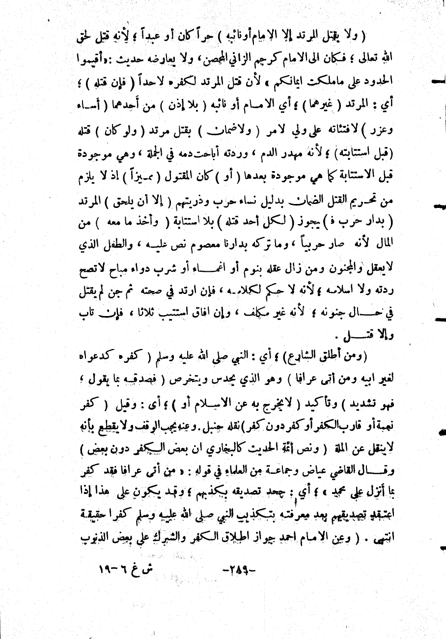 (وَمَنْ أَطْلَقَ الشَّارِعُ) ؛ أَيْ: النَّبِيُّ - صَلَّى اللَّهُ عَلَيْهِ وَسَلَّمَ - (كُفْرَهُ كَدَعْوَاهُ لِغَيْرِ أَبِيهِ وَمَنْ أَتَى عَرَّافًا) وَهُوَ الَّذِي يَحْدُسُ وَيَتَخَرَّصُ (فَصَدَّقَهُ بِمَا يَقُولُ، فَهُوَ تَشْدِيدٌ) وَتَأْكِيدٌ (لَا يَخْرُجُ بِهِ عَنْ الْإِسْلَامِ أَوْ) ؛ أَيْ: وَقِيلَ (كُفْرُ نِعْمَةٍ أَوْ قَارَبَ الْكُفْرَ أَوْ كُفْرٌ دُونَ كُفْرٍ) نَقَلَهُ حَنْبَلٌ.