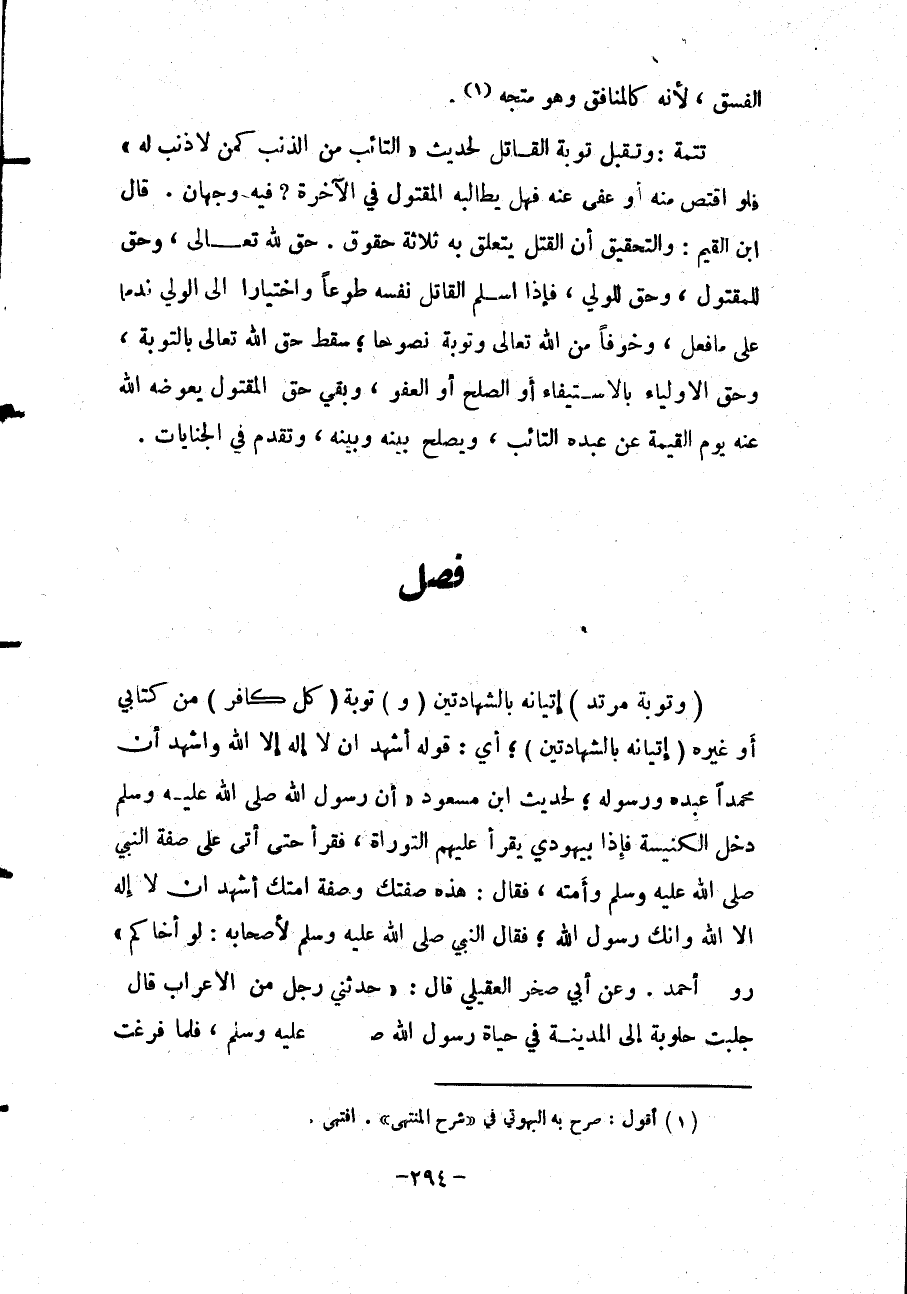 (وَتَوْبَةُ مُرْتَدٍّ) إتْيَانُهُ بِالشَّهَادَتَيْنِ (وَ) تَوْبَةُ (كُلِّ كَافِرٍ) مِنْ كِتَابِيٍّ أَوْ غَيْرِهِ (إتْيَانُهُ بِالشَّهَادَتَيْنِ) ؛ أَيْ: قَوْلُهُ أَشْهَدُ أَنْ لَا إلَهَ إلَّا اللَّهُ وَأَشْهَدُ أَنَّ مُحَمَّدًا عَبْدُهُ وَرَسُولُهُ؛ لِحَدِيثِ ابْنِ مَسْعُودٍ «أَنَّ رَسُولَ اللَّهِ - صَلَّى اللَّهُ عَلَيْهِ وَسَلَّمَ - دَخَلَ الْكَنِيسَةَ فَإِذَا؛ بِيَهُودِيٍّ يَقْرَأُ عَلَيْهِمْ التَّوْرَاةَ، فَقَرَأَ حَتَّى أَتَى عَلَى صِفَةِ النَّبِيِّ - صَلَّى اللَّهُ عَلَيْهِ وَسَلَّمَ - وَأُمَّتِهِ، فَقَالَ: هَذِهِ صِفَتُك وَصِفَةُ أُمَّتِك أَشْهَدُ أَنْ لَا إلَهَ إلَّا اللَّهُ وَأَنَّك رَسُولُ اللَّهِ؛ فَقَالَ النَّبِيُّ - صَلَّى اللَّهُ عَلَيْهِ وَسَلَّمَ - لِأَصْحَابِهِ: لَوْ أَخَاكُمْ» رَوَاهُ أَحْمَدُ.
