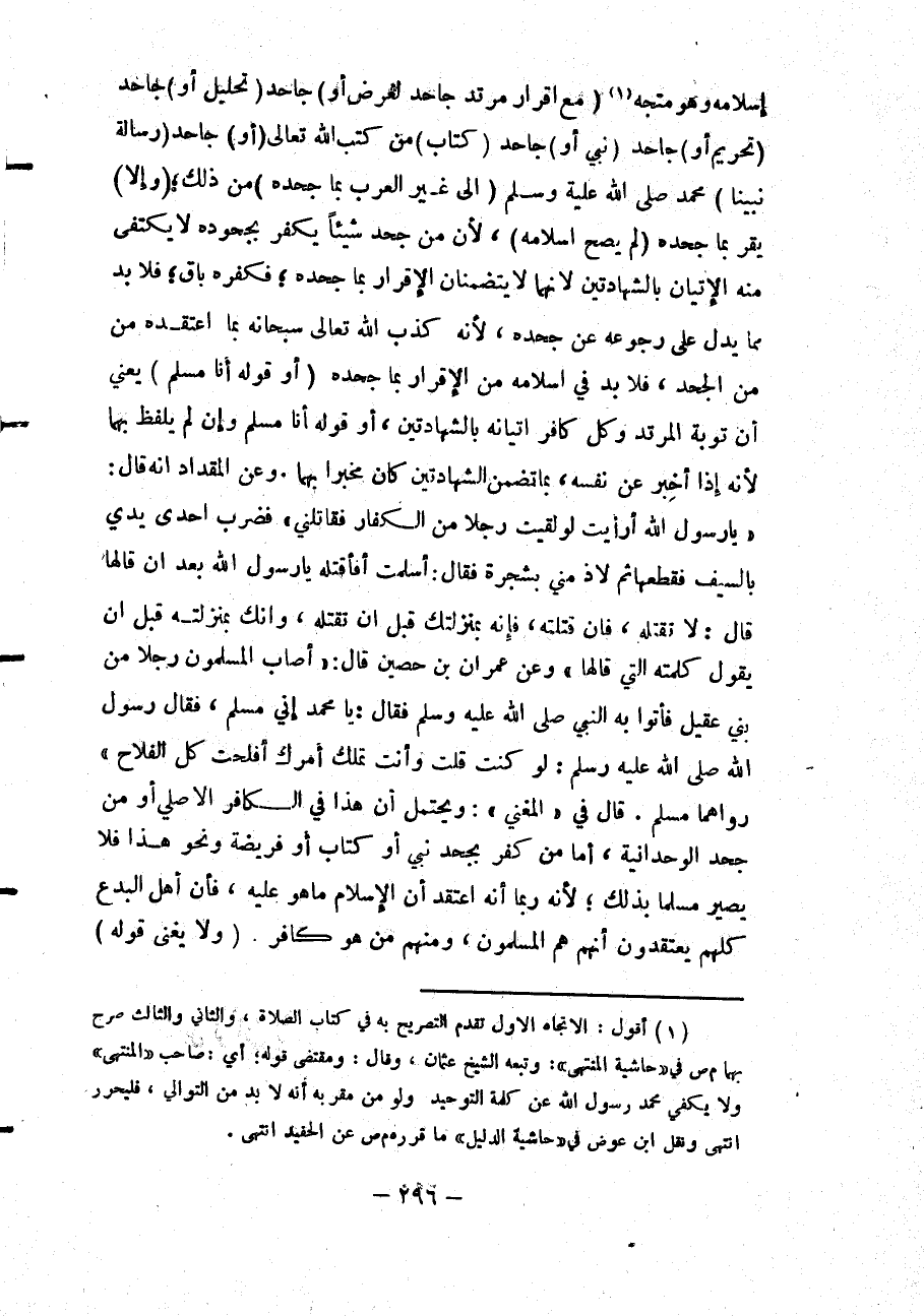 قَالَ فِي " الْمُغْنِي ": وَيُحْتَمَلُ أَنَّ هَذَا فِي الْكَافِرِ الْأَصْلِيِّ أَوْ مَنْ جَحَدَ الْوَحْدَانِيَّةَ، أَمَّا مَنْ كَفَرَ بِجَحْدِ نَبِيٍّ أَوْ كِتَابٍ أَوْ فَرِيضَةٍ وَنَحْوِ هَذَا فَلَا يَصِيرُ مُسْلِمًا بِذَلِكَ؛ لِأَنَّهُ رُبَّمَا أَنَّهُ اعْتَقَدَ أَنَّ الْإِسْلَامَ مَا هُوَ عَلَيْهِ، فَإِنَّ أَهْلَ الْبِدَعِ كُلَّهُمْ يَعْتَقِدُونَ أَنَّهُمْ هُمْ الْمُسْلِمُونَ، وَمِنْهُمْ مَنْ هُوَ كَافِرٌ.