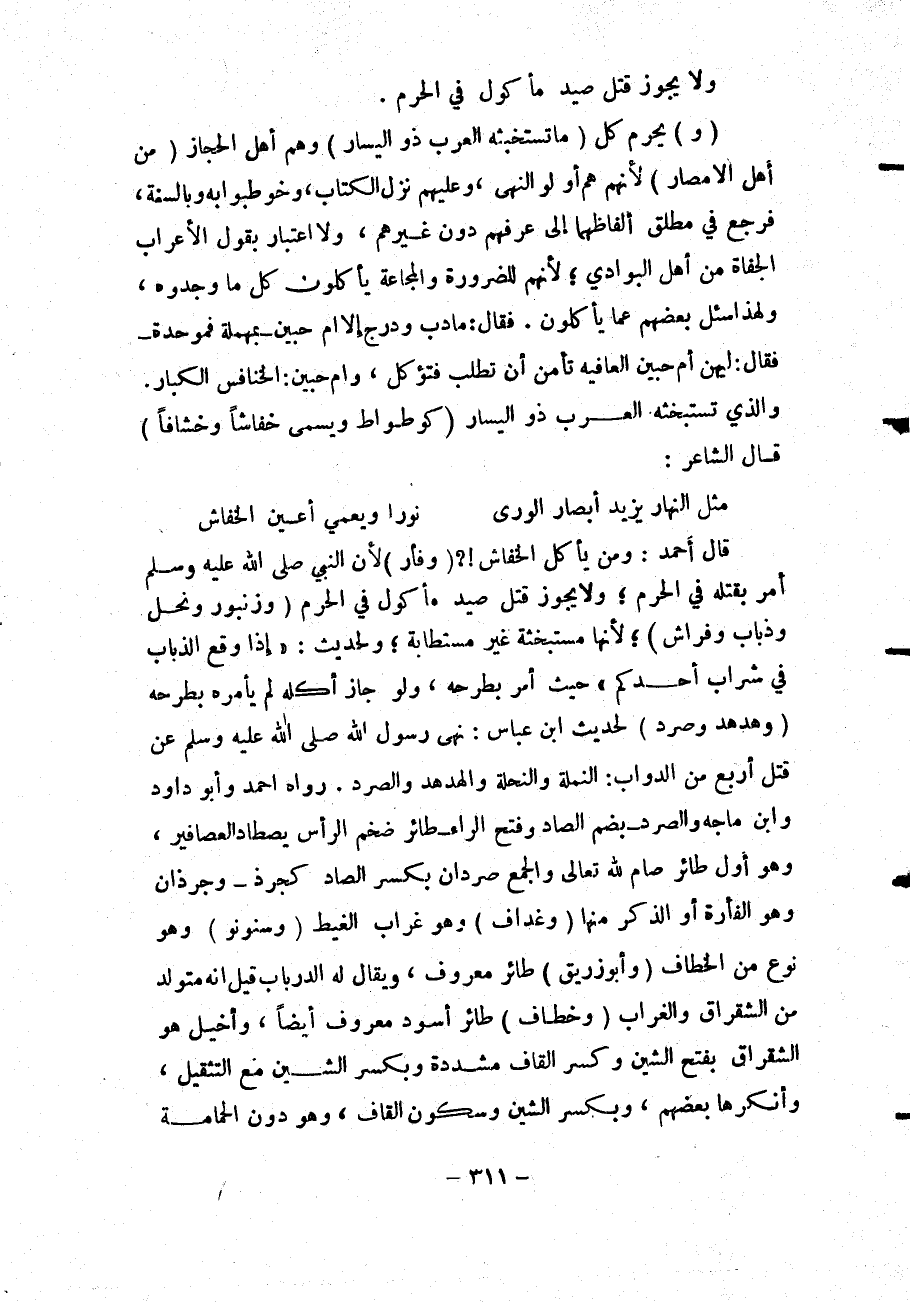 وَالصُّرَدُ - بِضَمِّ الصَّادِ وَفَتْحِ الرَّاءِ - طَائِرٌ ضَخْمُ الرَّأْسِ يَصْطَادُ الْعَصَافِيرَ، وَهُوَ أَوَّلُ طَائِرٍ صَامَ لِلَّهِ تَعَالَى وَالْجَمْعُ صِرْدَانٍ بِكَسْرِ الصَّادِ كَجُرَذٍ - وَجِرْذَانٍ وَهُوَ الْفَأْرَةُ أَوْ الذَّكَرُ مِنْهَا (وَغُدَافٍ) وَهُوَ غُرَابُ الْغَيْطِ (وسنونو) وَهُوَ نَوْعٌ مِنْ الْخُطَّافِ (وَأَبِي زُرَيْقٍ) طَائِرٌ مَعْرُوفٌ، وَيُقَالُ لَهُ الدَّرْبَابُ قِيلَ أَنَّهُ مُتَوَلِّدٌ مِنْ الشِّقَرَّاقِ وَالْغُرَابِ (وَخُطَّافٍ) طَائِرٌ أَسْوَدُ مَعْرُوفٌ أَيْضًا، وَأَخْيَلُ هُوَ الشِّقَرَّاقُ بِفَتْحِ الشِّينِ وَكَسْرِ الْقَافِ مُشَدَّدَةٍ وَبِكَسْرِ الشِّينِ مَعَ التَّثْقِيلِ، وَأَنْكَرَهَا بَعْضُهُمْ، وَبِكَسْرِ الشِّينِ وَسُكُونِ الْقَافِ، وَهُوَ دُونَ الْحَمَامَةِ
