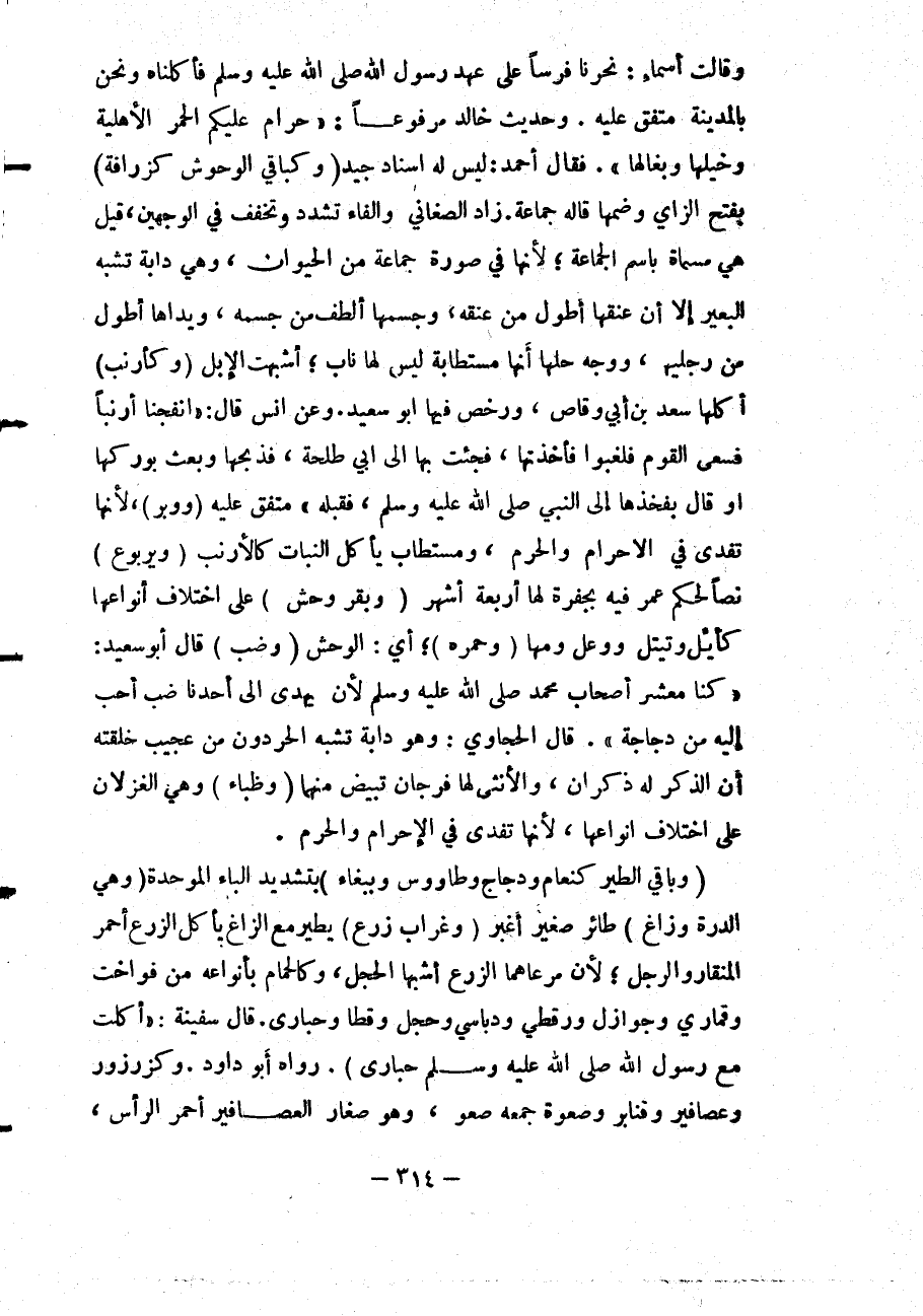 وَحَدِيثُ خَالِدٍ مَرْفُوعًا: «حَرَامٌ عَلَيْكُمْ الْحُمُرُ الْأَهْلِيَّةُ وَخَيْلُهَا وَبِغَالُهَا» . فَقَالَ أَحْمَدُ: لَيْسَ لَهُ إسْنَادٌ جَيِّدٌ (وَكَبَاقِي الْوُحُوشِ كَزَرَافَةٍ) بِفَتْحِ الزَّايِ وَضَمِّهَا قَالَهُ جَمَاعَةٌ. زَادَ الصَّغَانِيُّ وَالْفَاءُ تُشَدَّدُ وَتُخَفَّفُ فِي الْوَجْهَيْنِ، قِيلَ هِيَ مُسَمَّاةٌ بِاسْمِ الْجَمَاعَةِ؛ لِأَنَّهَا فِي صُورَةِ جَمَاعَةٍ مِنْ الْحَيَوَانِ، وَهِيَ دَابَّةٌ تُشْبِهُ الْبَعِيرَ إلَّا أَنَّ عُنُقَهَا أَطْوَلُ مِنْ عُنُقِهِ، وَجِسْمَهَا أَلْطَفُ مِنْ جِسْمِهِ، وَيَدَاهَا أَطْوَلُ مِنْ رِجْلَيْهَا، وَوَجْهُ حِلِّهَا أَنَّهَا مُسْتَطَابَةٌ لَيْسَ لَهَا نَابٌ؛ أَشْبَهَتْ الْإِبِلَ (وَكَأَرْنَبٍ) أَكَلَهَا سَعْدُ بْنُ أَبِي وَقَّاصٍ، وَرَخَّصَ فِيهَا أَبُو سَعِيدٍ.
