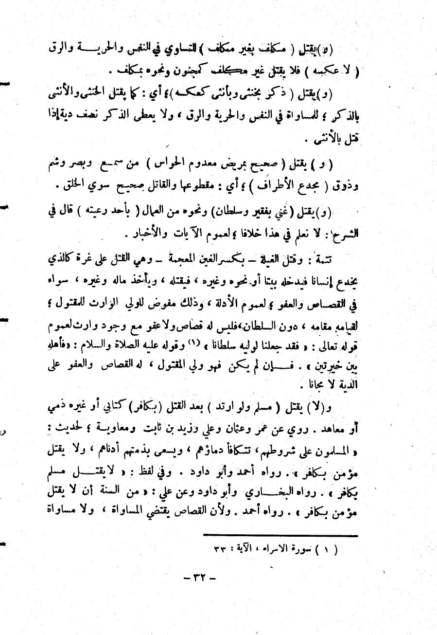 رُوِيَ عَنْ عُمَرَ وَعُثْمَانَ وَعَلِيٍّ وَزَيْدِ بْنِ ثَابِتٍ وَمُعَاوِيَةَ؛ لِحَدِيثِ: «الْمُسْلِمُونَ عَلَى شُرُوطِهِمْ، تَتَكَافَأُ دِمَاؤُهُمْ، وَيَسْعَى بِذِمَّتِهِمْ أَدْنَاهُمْ، وَلَا يُقْتَلُ مُؤْمِنٌ بِكَافِرٍ» رَوَاهُ أَحْمَدُ، وَأَبُو دَاوُد وَفِي لَفْظٍ: «لَا يُقْتَلُ مُسْلِمٌ بِكَافِرٍ» رَوَاهُ الْبُخَارِيُّ وَأَبُو دَاوُد