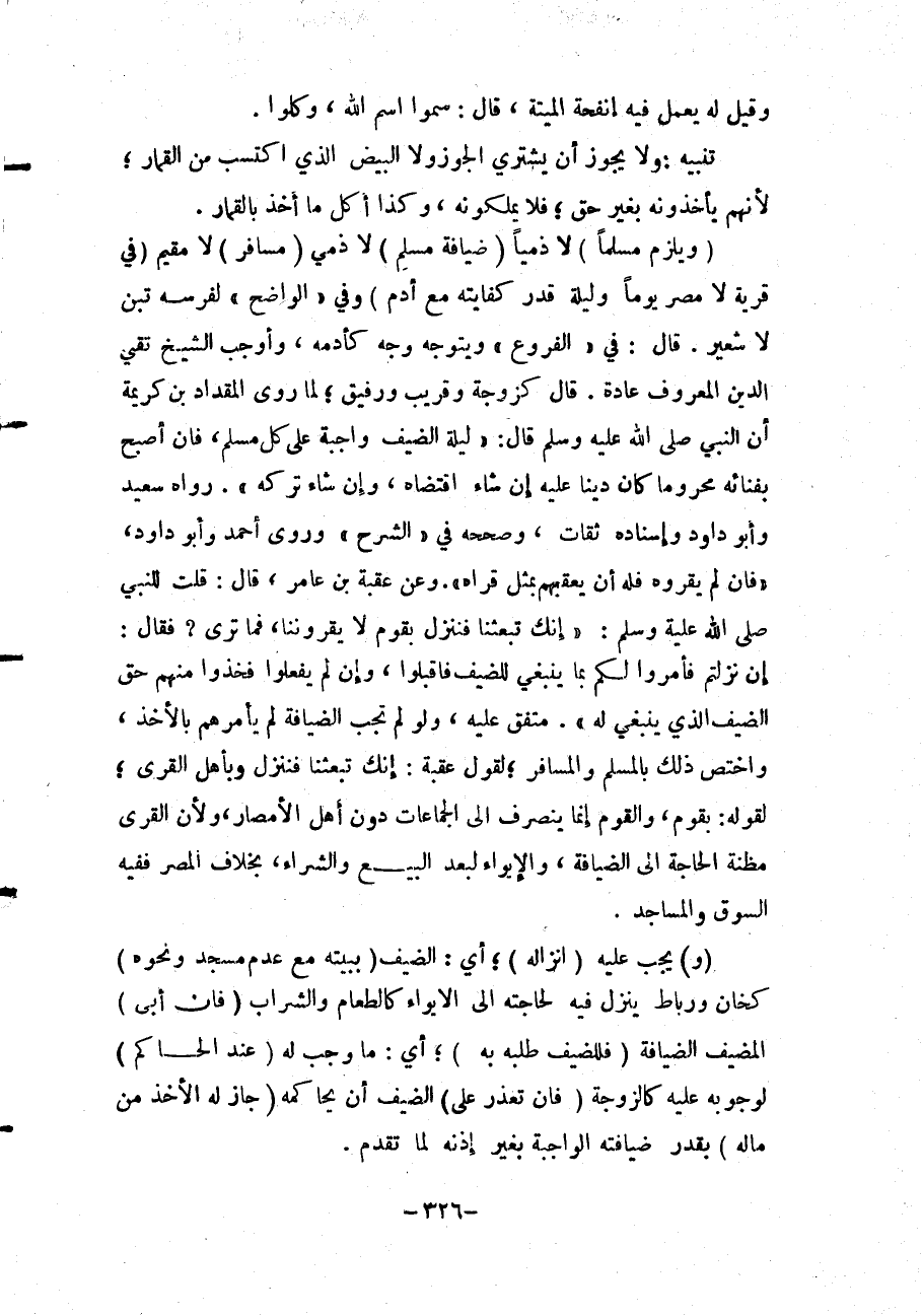 وَعَنْ عُقْبَةَ بْنِ عَامِرٍ، قَالَ: «قُلْت لِلنَّبِيِّ - صَلَّى اللَّهُ عَلَيْهِ وَسَلَّمَ -: إنَّك تَبْعَثُنَا فَنَنْزِلُ بِقَوْمٍ لَا يَقْرُونَنَا، فَمَا تَرَى؟ فَقَالَ: إنْ نَزَلْتُمْ فَأَمَرُوا لَكُمْ بِمَا يَنْبَغِي لِلضَّيْفِ فَاقْبَلُوا، وَإِنْ لَمْ يَفْعَلُوا فَخُذُوا مِنْهُمْ حَقَّ الضَّيْفِ الَّذِي يَنْبَغِي لَهُ» . مُتَّفَقٌ عَلَيْهِ